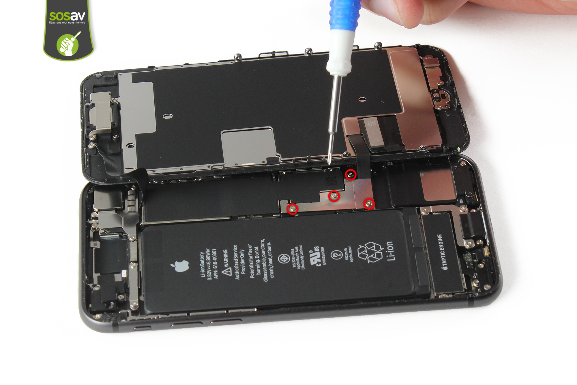 La batterie de l'iPhone 8 est maintenue par quatre adhésifs (encadrés en rouge sur la photo ci-contre).Décollez le premier adhésif à l'aide de la spatule en nylon.