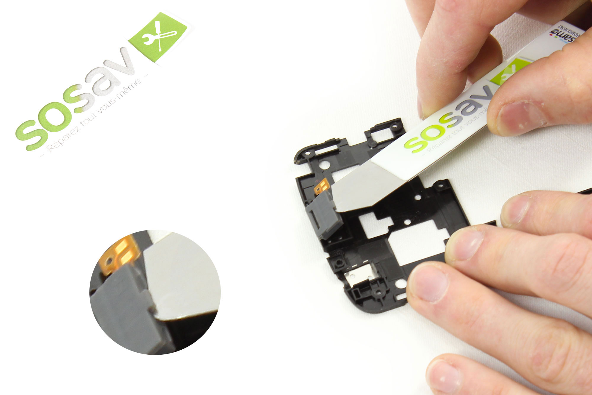 Toujours avec la spatule glissez-la entre le haut-parleur et son emplacement, faites levier afin de le soulever de ce côté là.