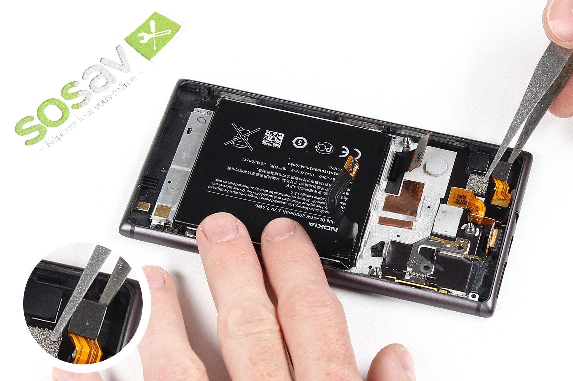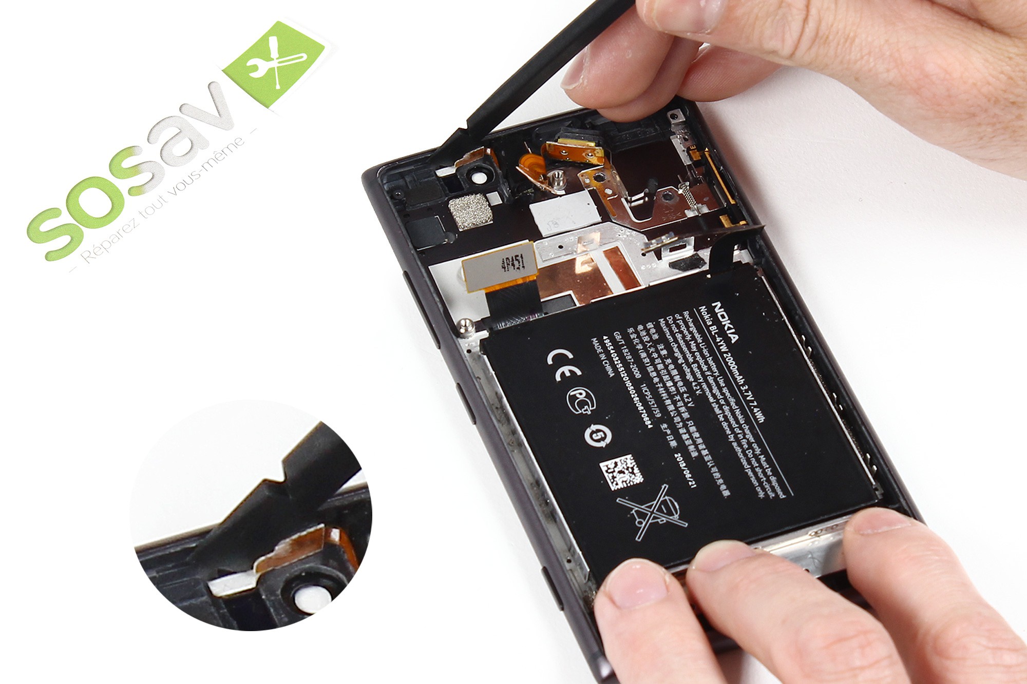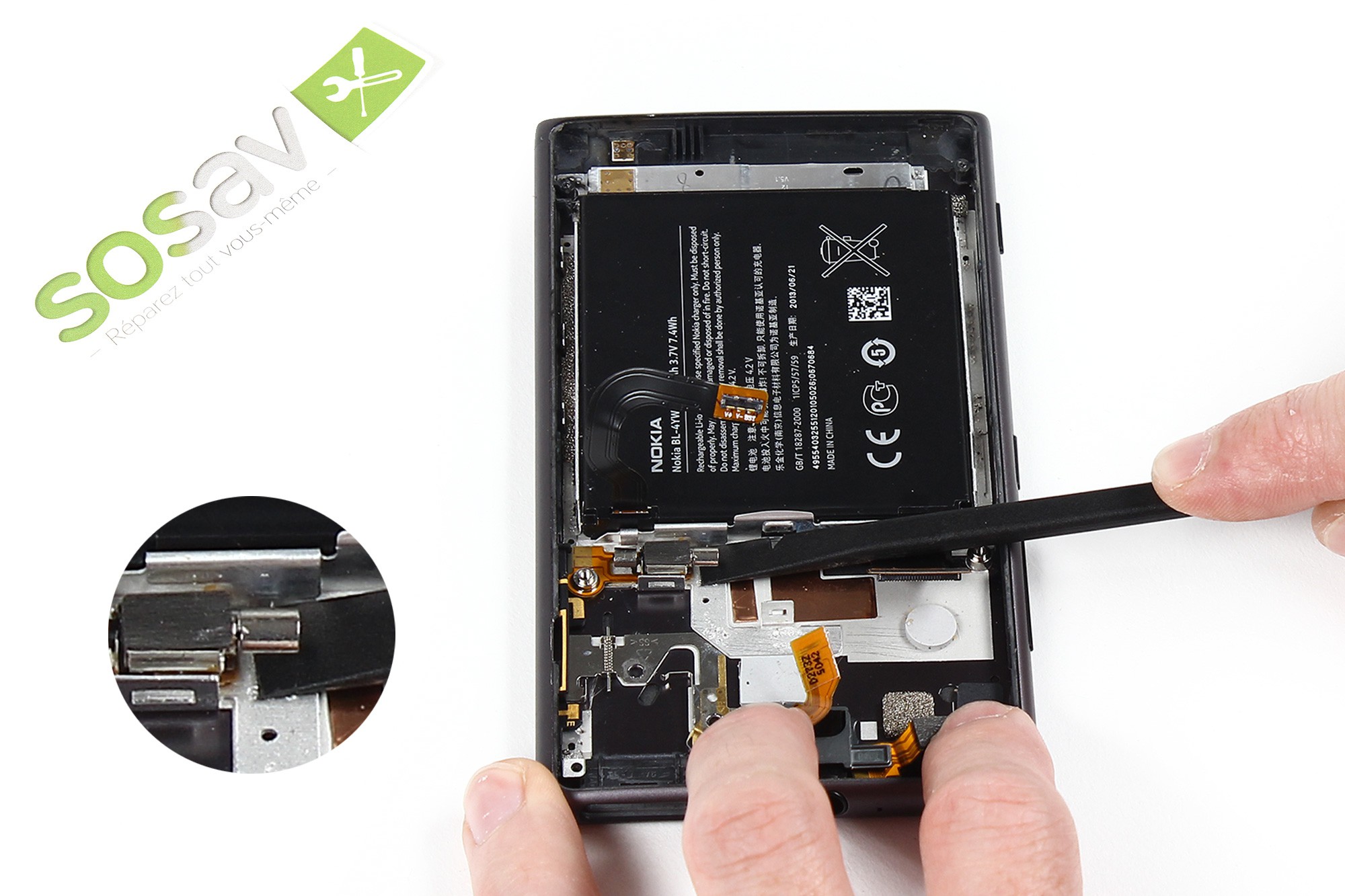 A nouveau à l'aide d'une spatule en nylon, faites délicatement levier afin de déconnecter la nappe de gestion des boutons (volumes, power, appareil photo).