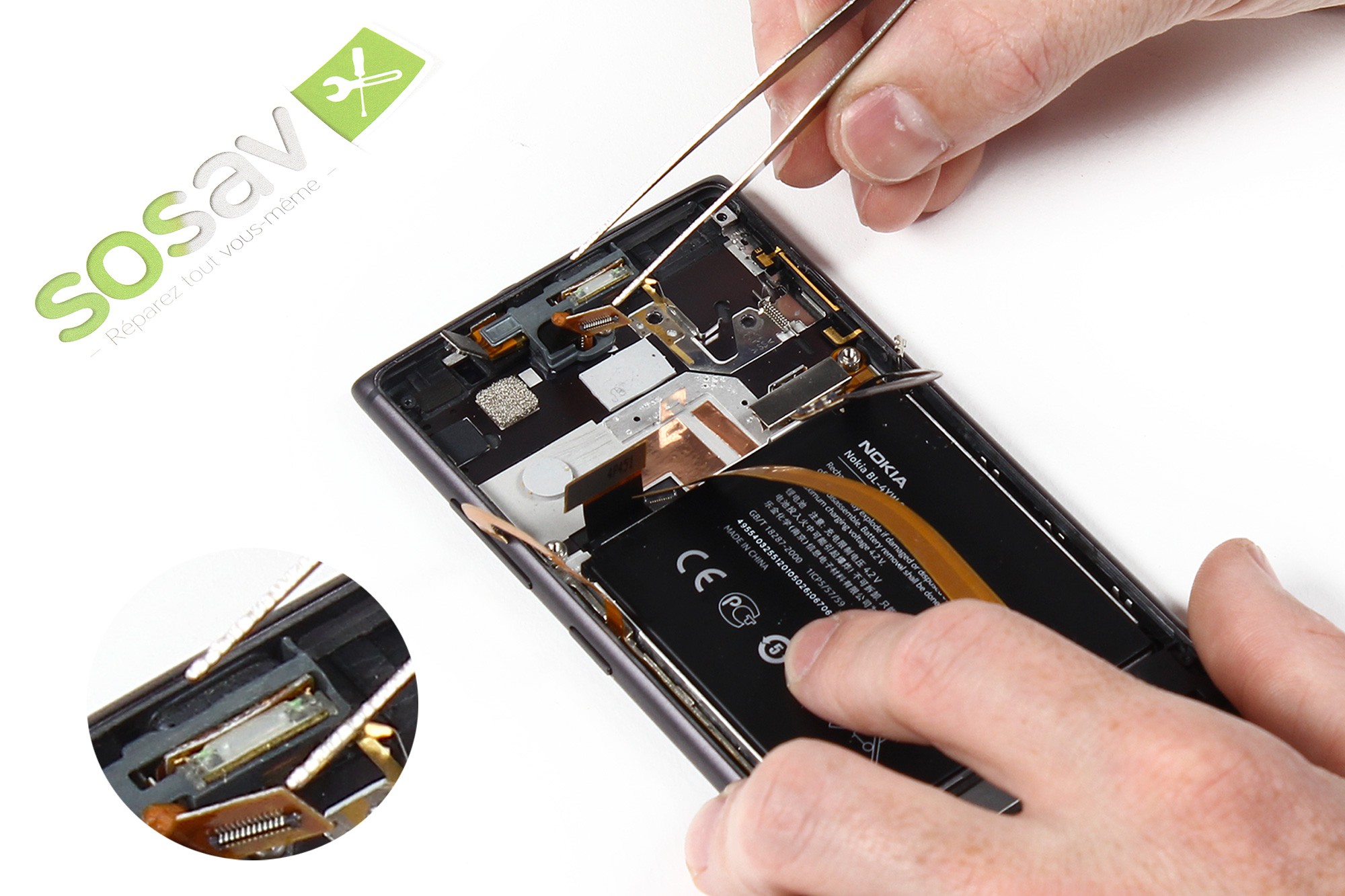 A nouveau à l'aide d'une spatule en nylon, faites délicatement levier afin de déconnecter la nappe de gestion des boutons (volumes, power, appareil photo).