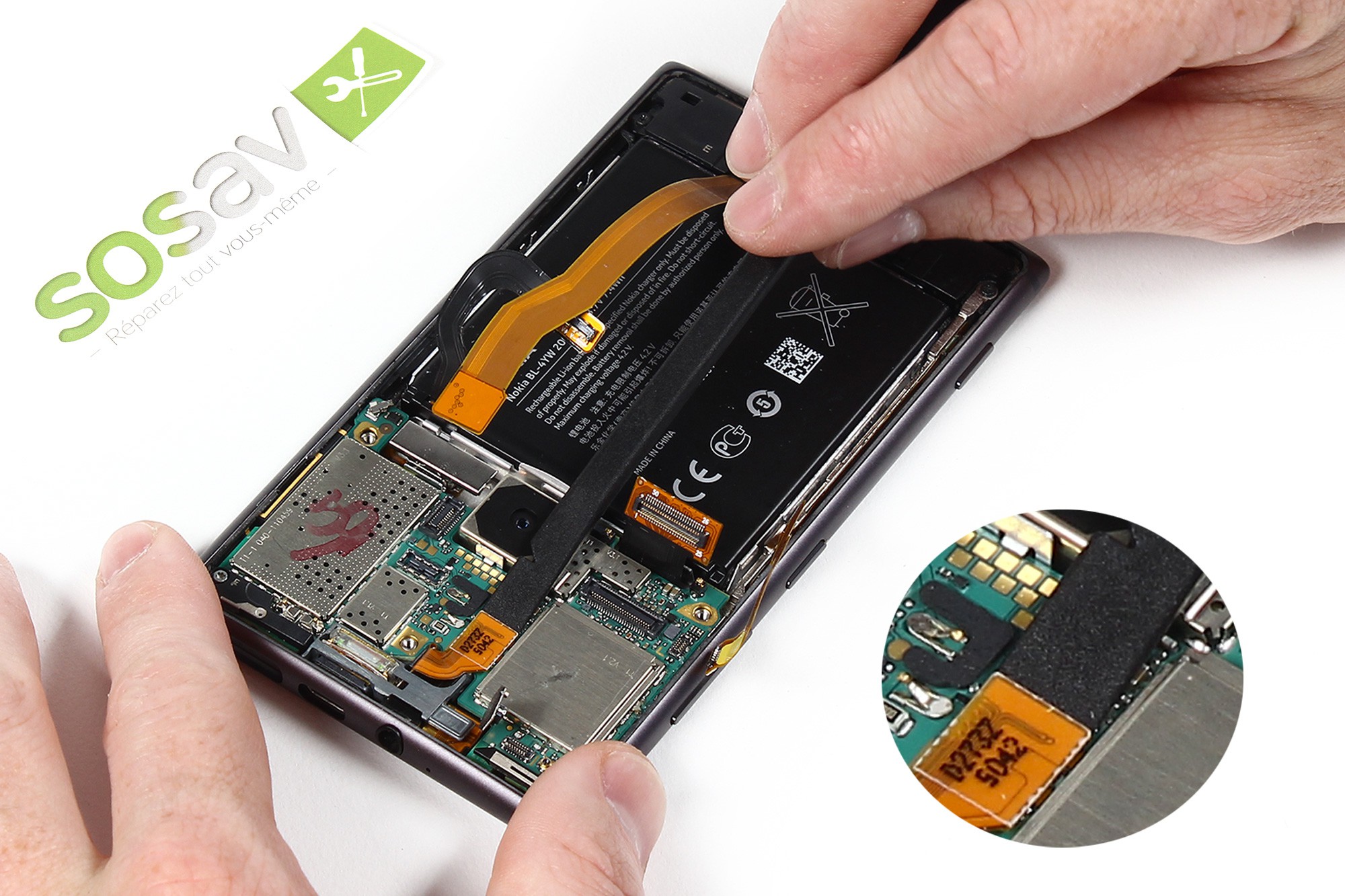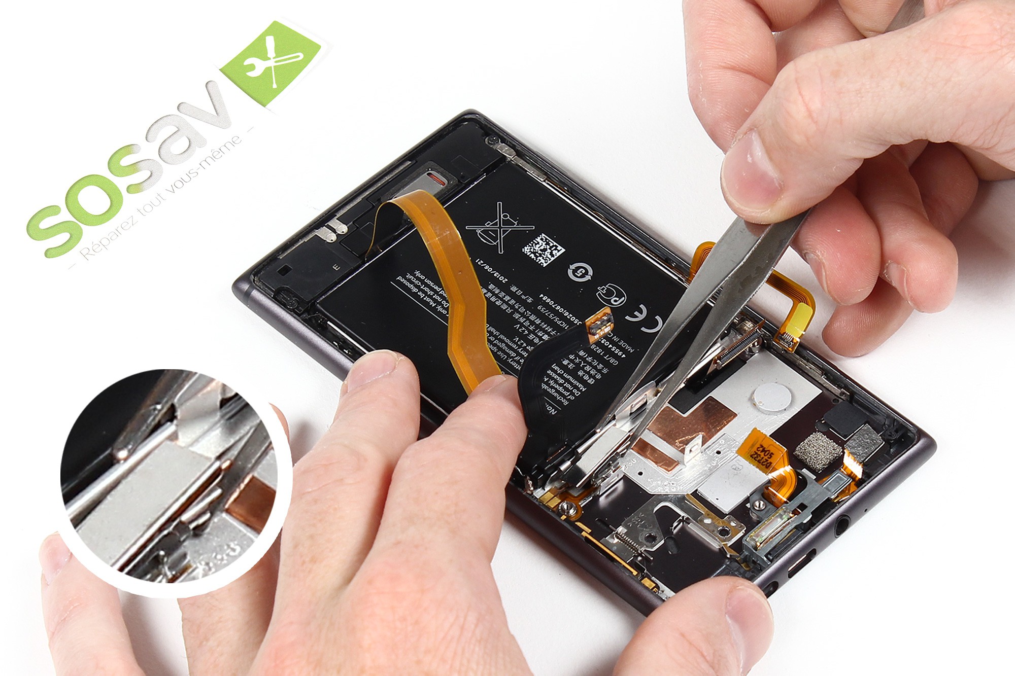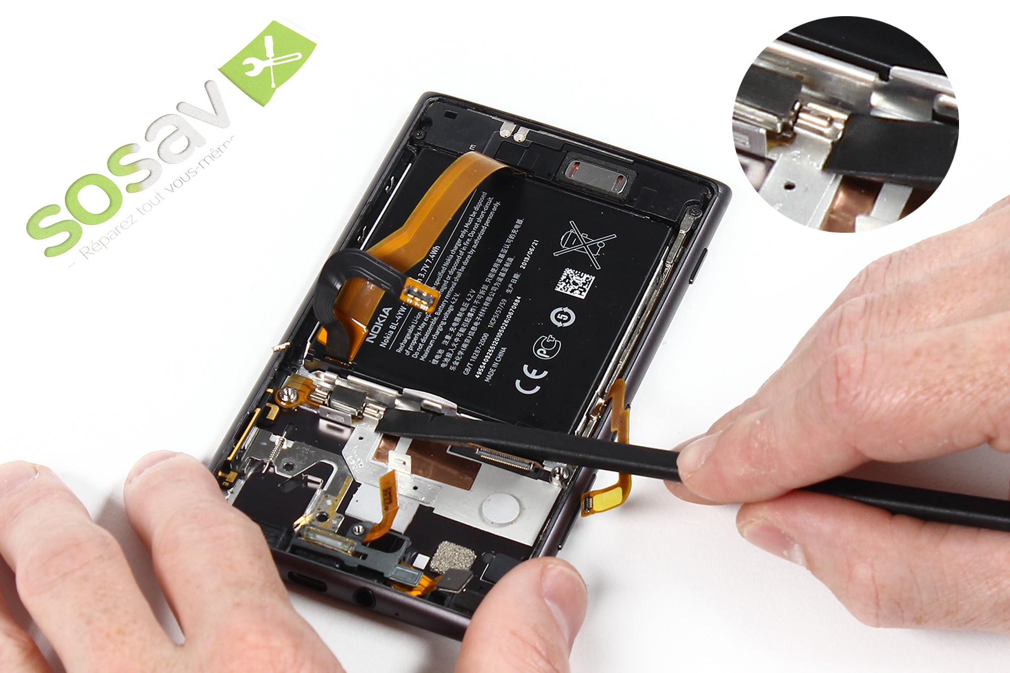 A nouveau à l'aide d'une spatule en nylon, faites délicatement levier afin de déconnecter la nappe de gestion des boutons (volumes, power, appareil photo).