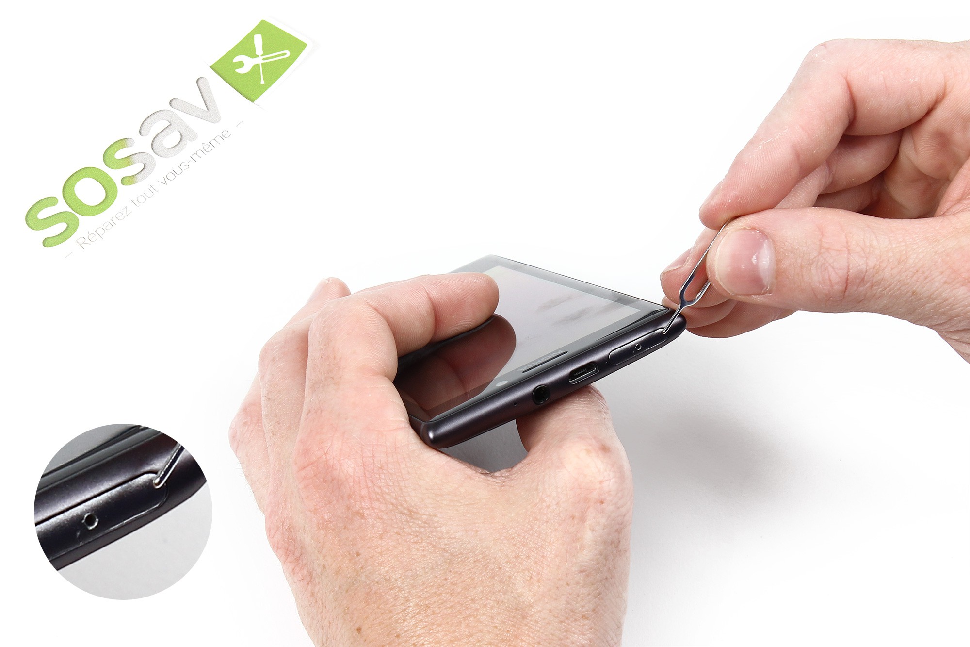 Insérez l'extracteur de carte SIM (ou un trombonne) dans le trou prévu à cet effet.