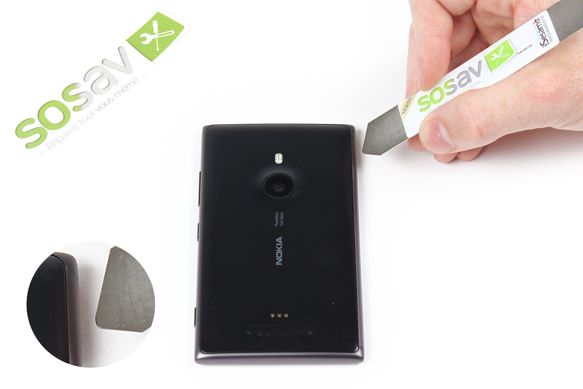 Insérez délicatement une spatule en métal (mieux qu'une spatule en nylon car plus ferme) entre la coque arrière et le châssis de l'écran de votre Nokia Lumia 925.