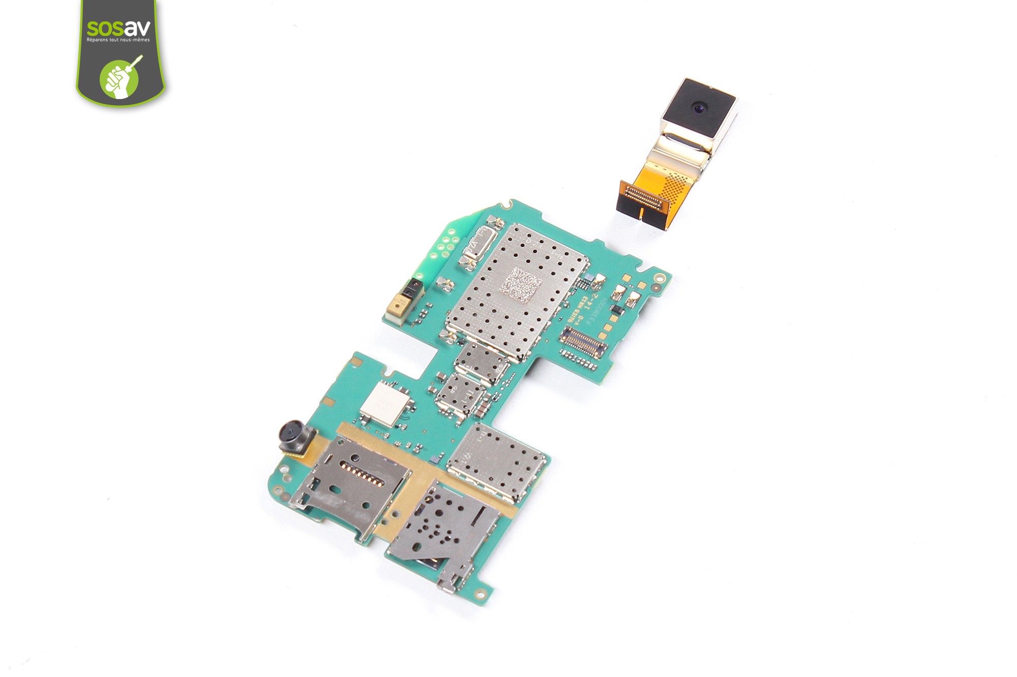 La carte mère du Nokia Lumia 1520 est désormais partiellement démontée.Saisissez ensuite la caméra arrière puis soulevez-la délicatement.