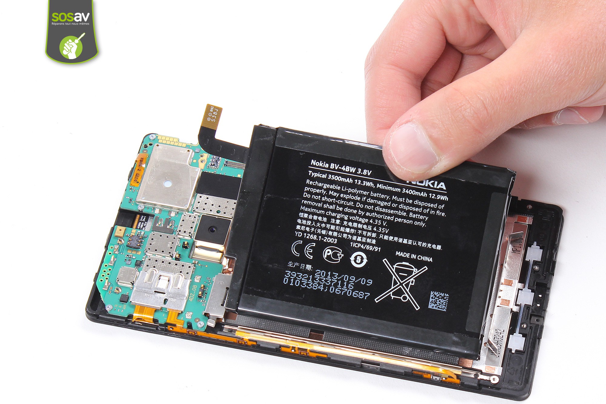 Reprenez la spatule en nylon afin de décoller délicatement la batterie du téléphone.Cette opération demande beaucoup de minutie en raison de la grande quantité de colle présente sous la batterie.