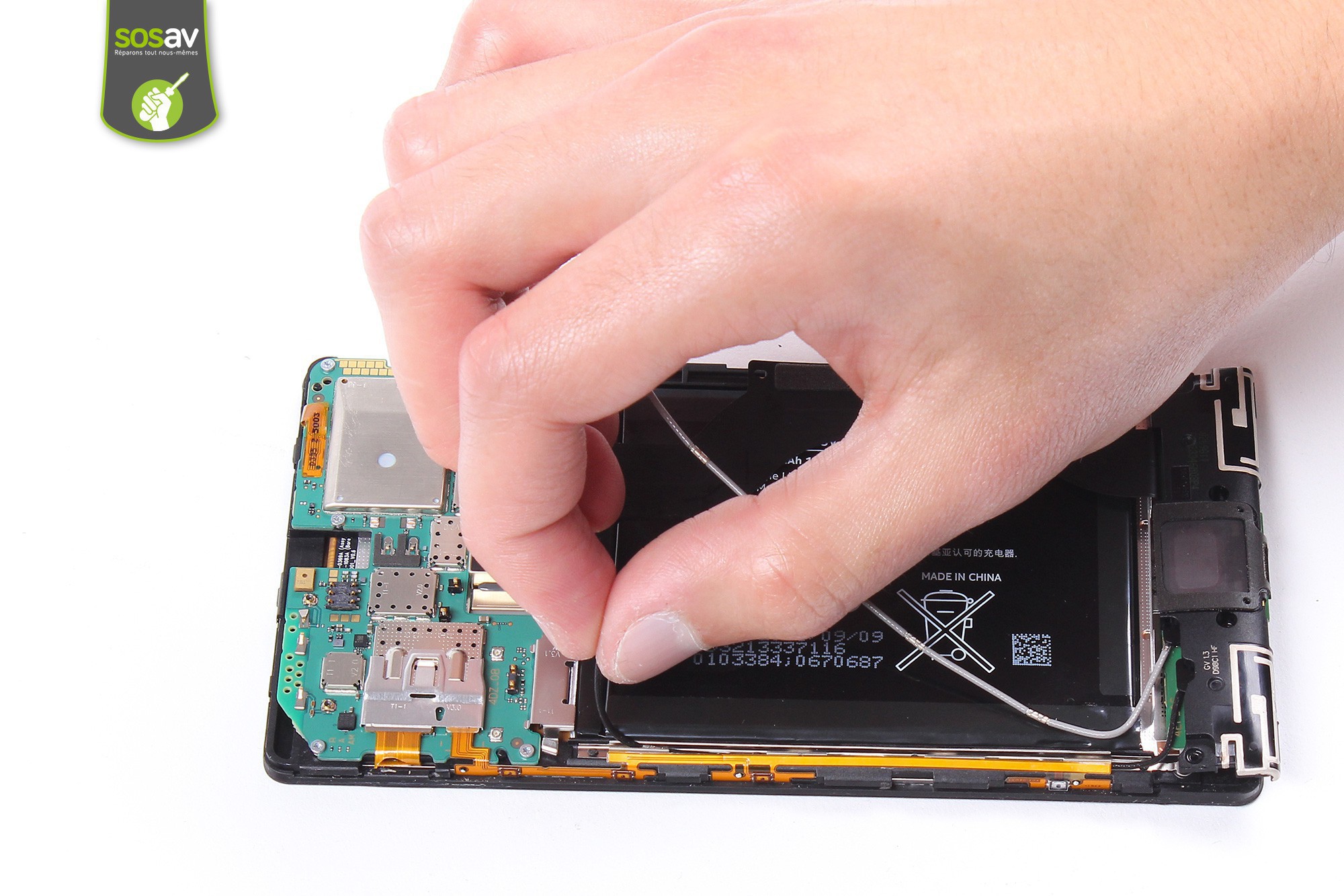 Par mesure de sécurité, il est nécessaire de déconnecter la batterie du téléphone avant de poursuivre le démontage.Utilisez la spatule en nylon afin de déconnecter le connecteur de la batterie.
