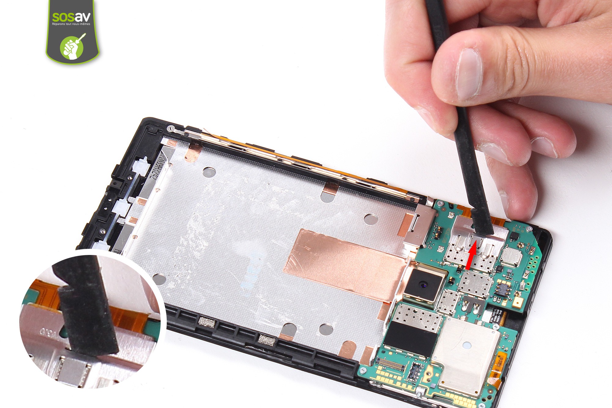 Utilisez la spatule en nylon afin de déconnecter ensuite l'écran LCD de la carte mère.Puis déconnecter également la nappe des boutons latéraux.