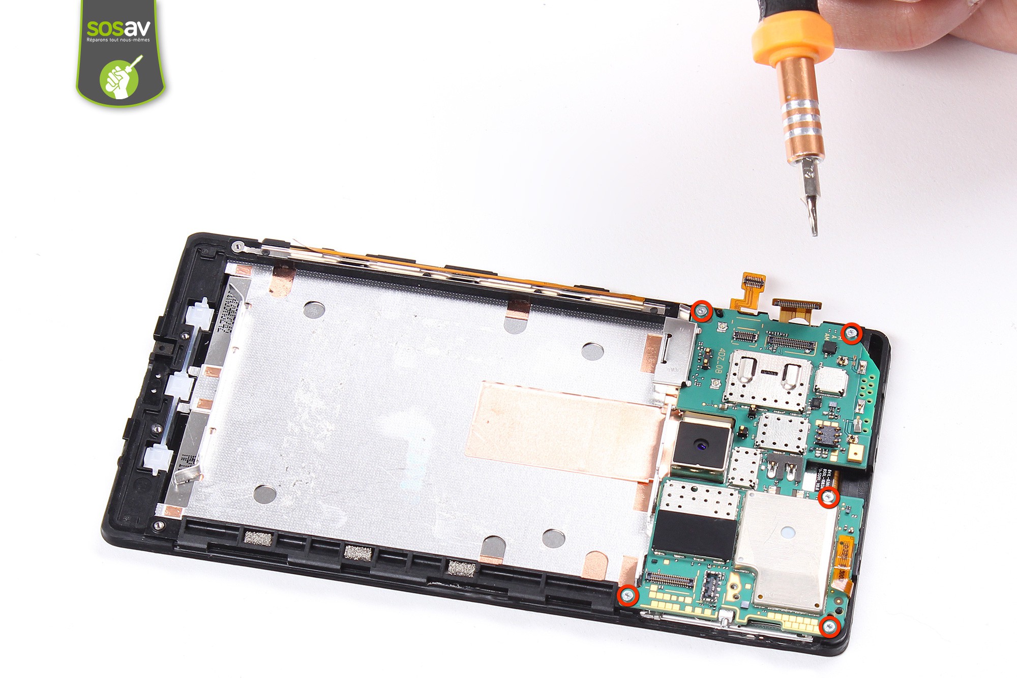 Utilisez ensuite un tournevis cruciforme afin de dévisser les 5 vis entourées en rouge.Ces vis servent à maintenir la carte mère sur le châssis du téléphone.