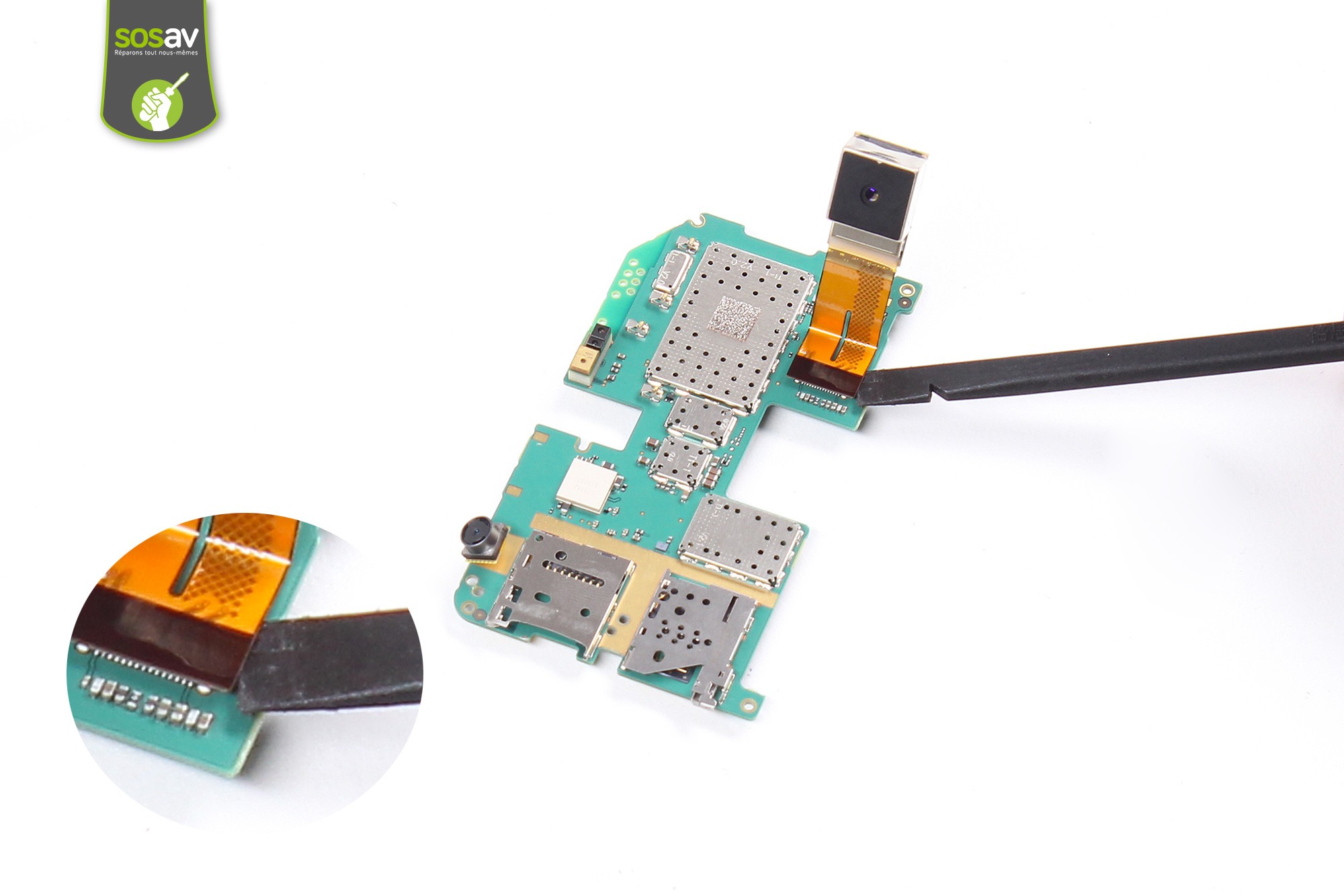 Avec la spatule en nylon, déconnectez en douceur la caméra arrière.Saisissez ensuite la caméra grâce à la pince puis retirez-la.