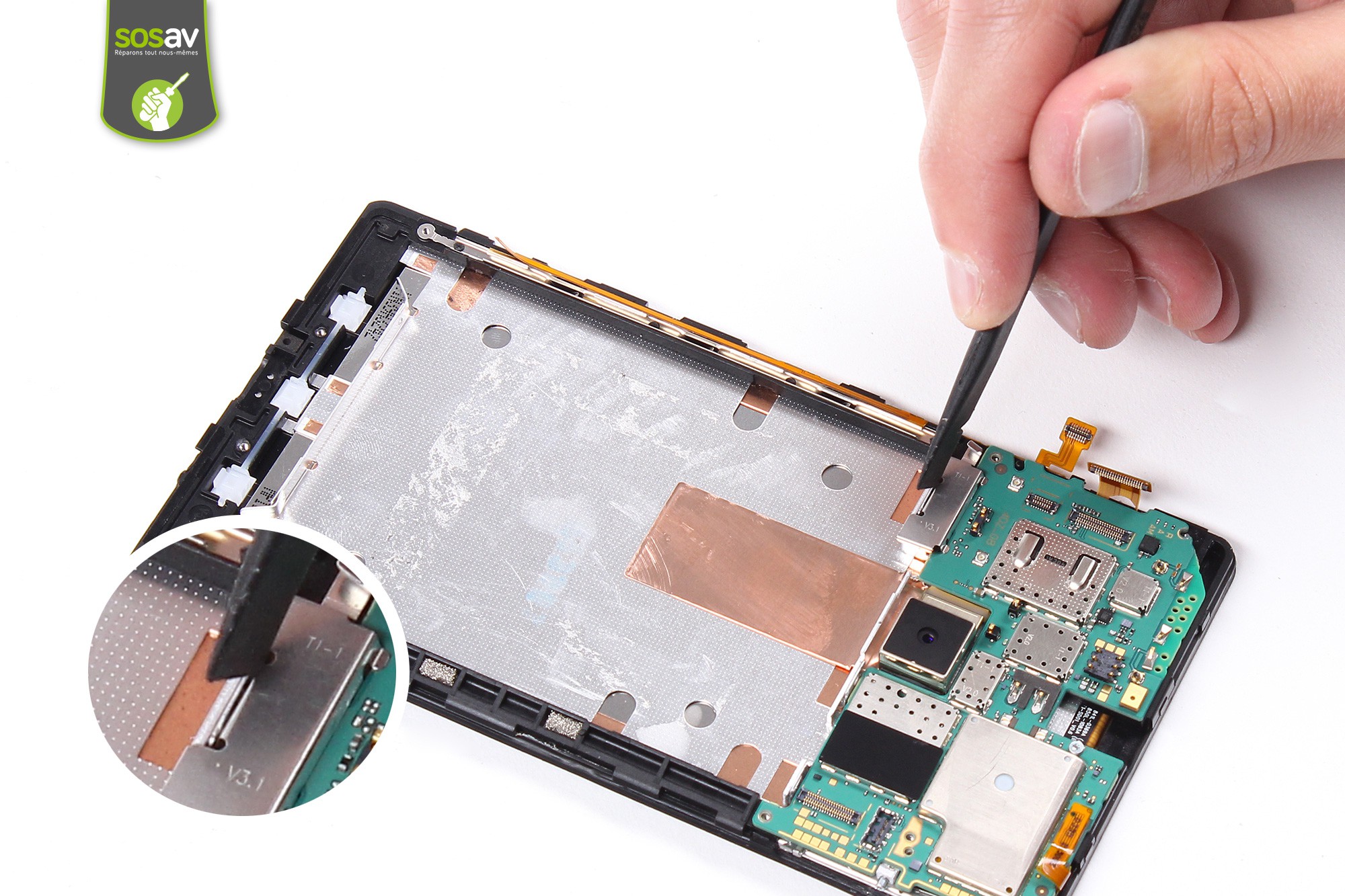 Prenez la spatule en nylon afin de déclipser l'élément métallique de protection des connecteurs de l'écran LCD et des boutons latéraux.Retirez-le ensuite, à l'aide de la pince.
