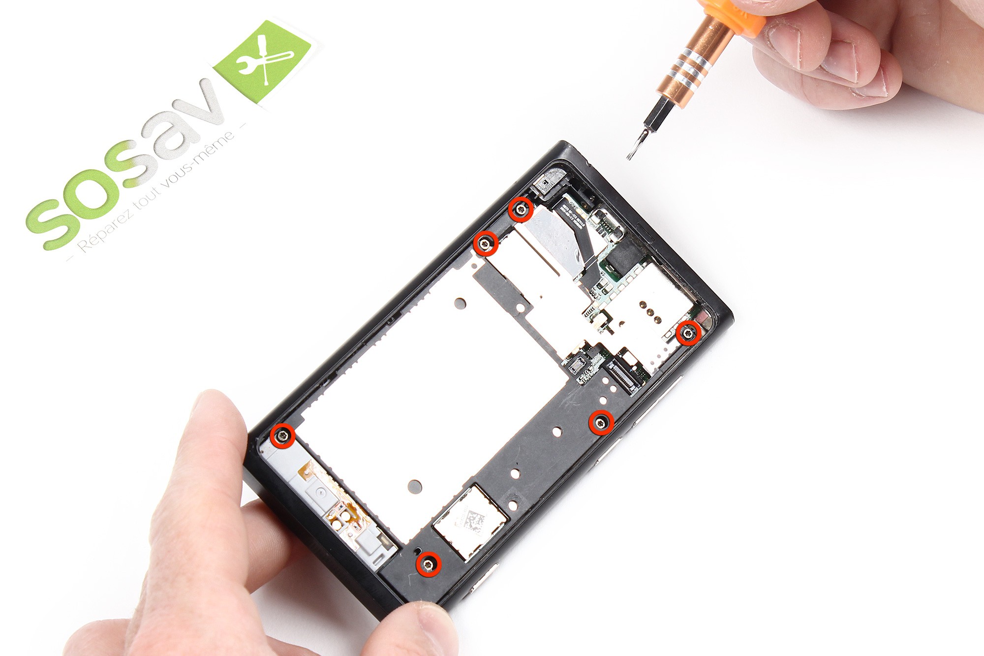 Dévissez les 6 vis torx T5 entourées en rouge sur la photo. Celles-ci retiennent l'écran au châssis de votre Nokia Lumia 800.
