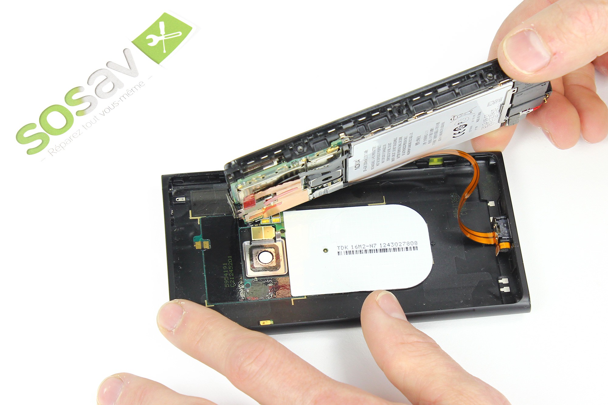 Puis soulevez cette nappe de connexion, afin de la débrancher de la carte mère de votre Nokia Lumia 920.