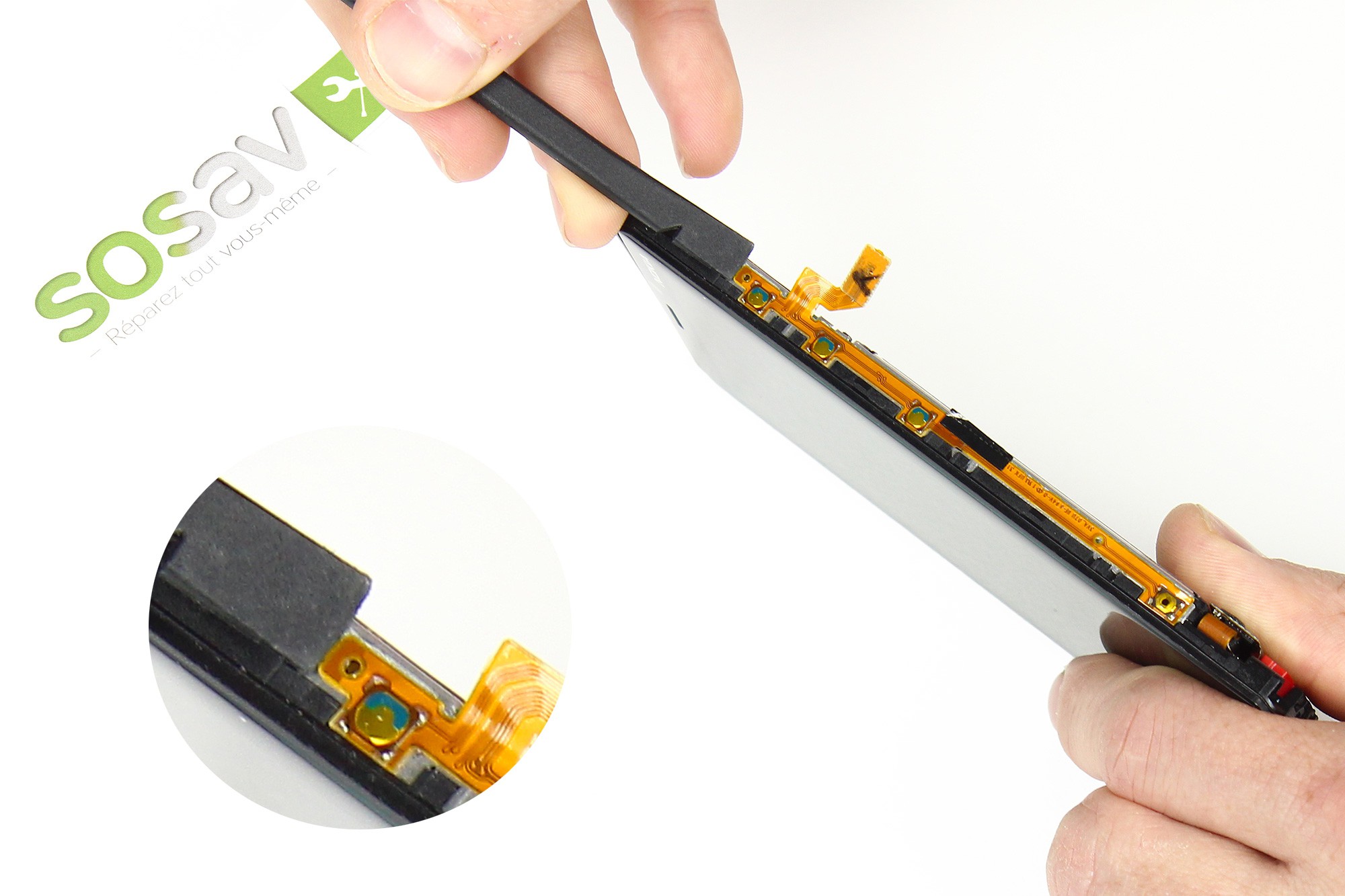 A l'aide d'une spatule en nylon, faites délicatement levier afin de déconnecter la nappe de gestion des boutons (power, vibreur, volume) de la carte-mère.