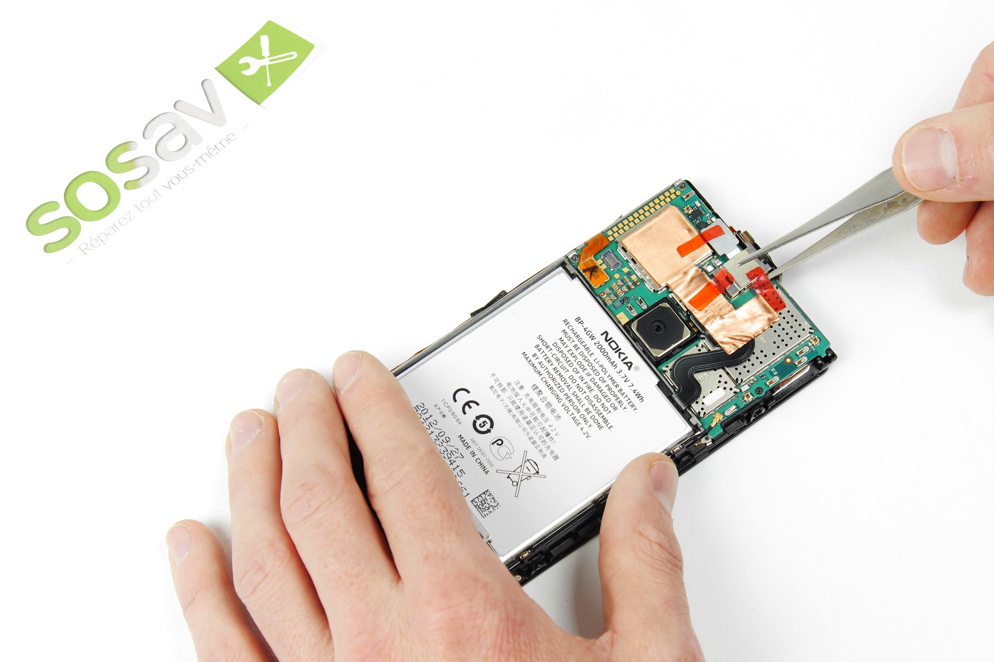 Puis soulevez cette nappe de connexion, afin de la débrancher de la carte mère de votre Nokia Lumia 920.
