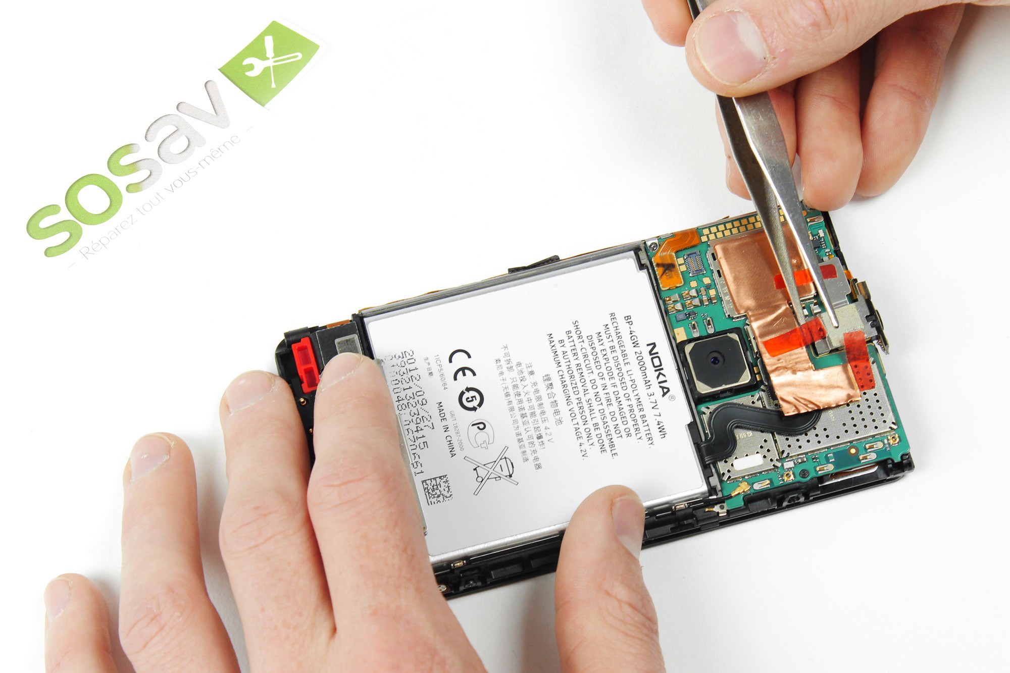 Munissez-vous d'une pince (incluse dans notre kit outils), puis décoller successivement les 3 autocollants rouges retenant la prise jack.