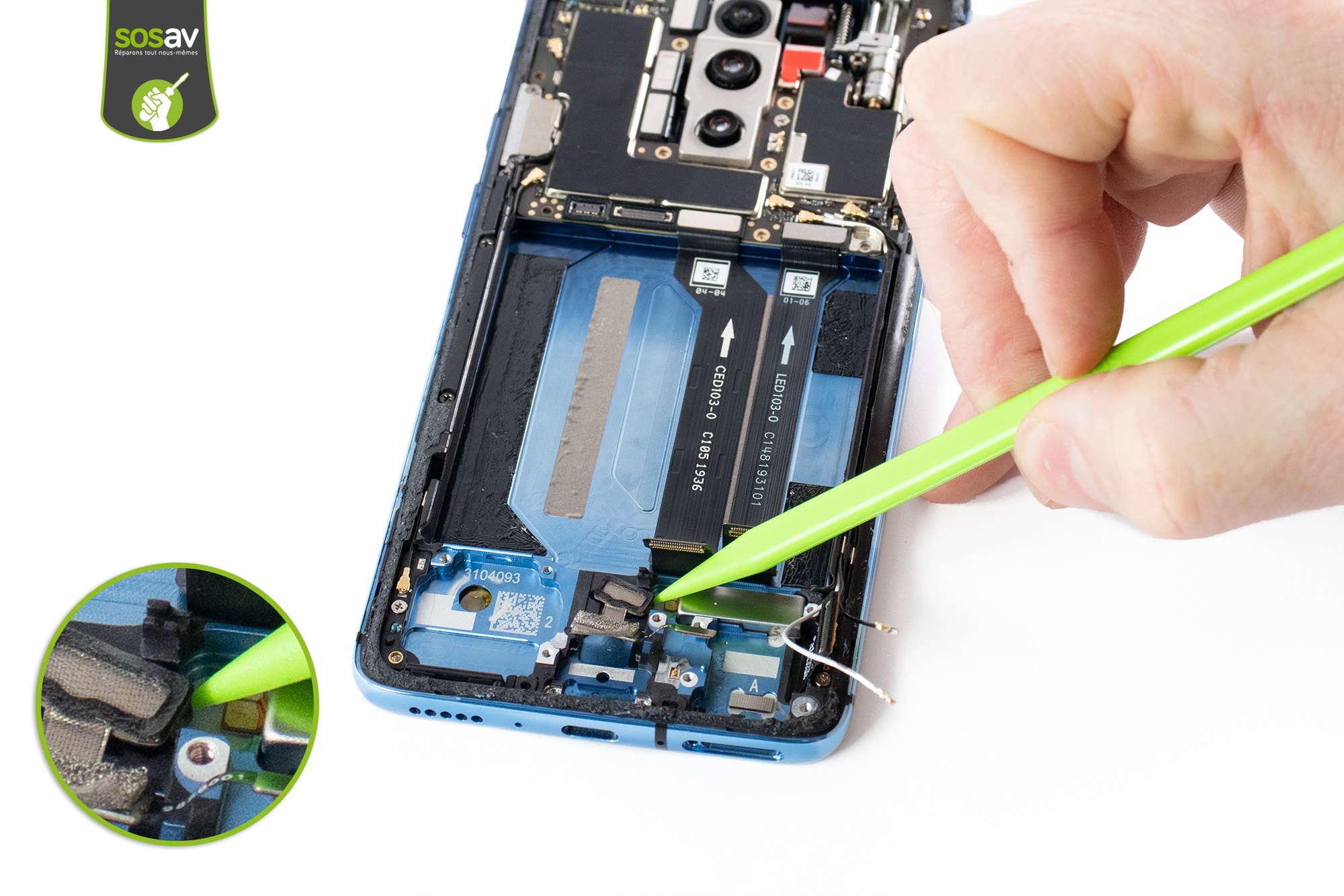 Avant de poursuivre, il faut déconnecter la batterie afin d'éviter les éventuels courts-circuits lors de la réparation OnePlus 7T Pro !Dévissez les 11 vis cruciformes entourées en bleu. (Photo 1)Avec la spatule en nylon, décollez ensuite le cache noir qui recouvre la nappe flash.Et sortez-le avec la pince.