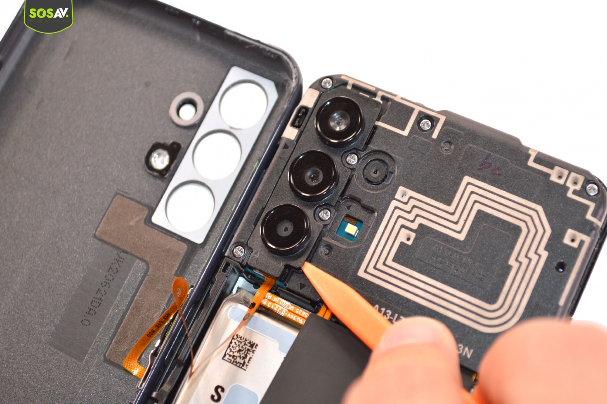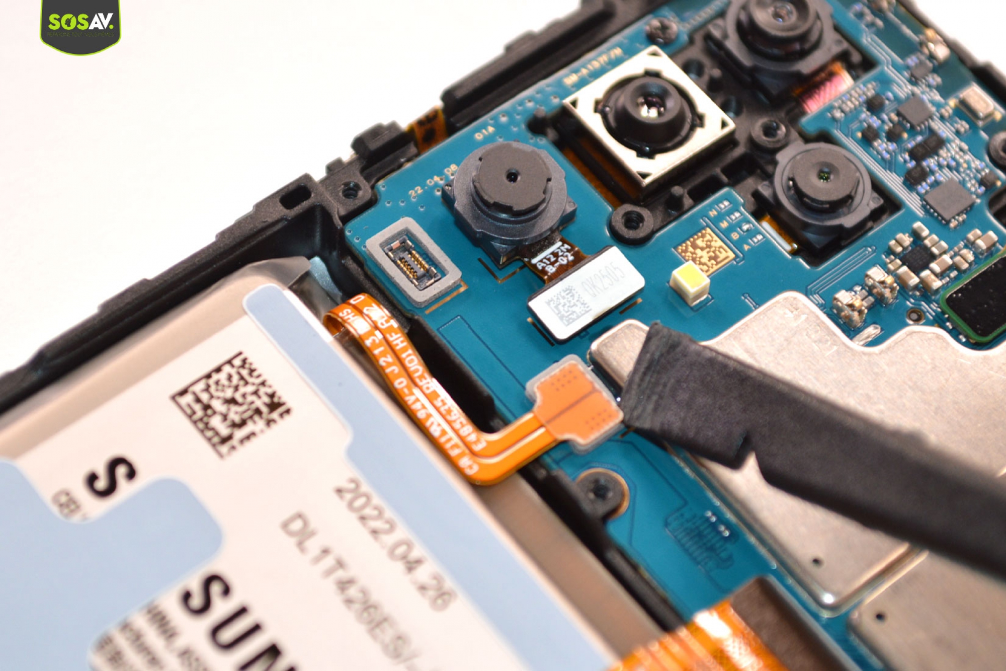 Une fois les lentilles mise de coté, débranchez la nappe du lecteur d'empreintes pour mettre de coté la coque arrière.