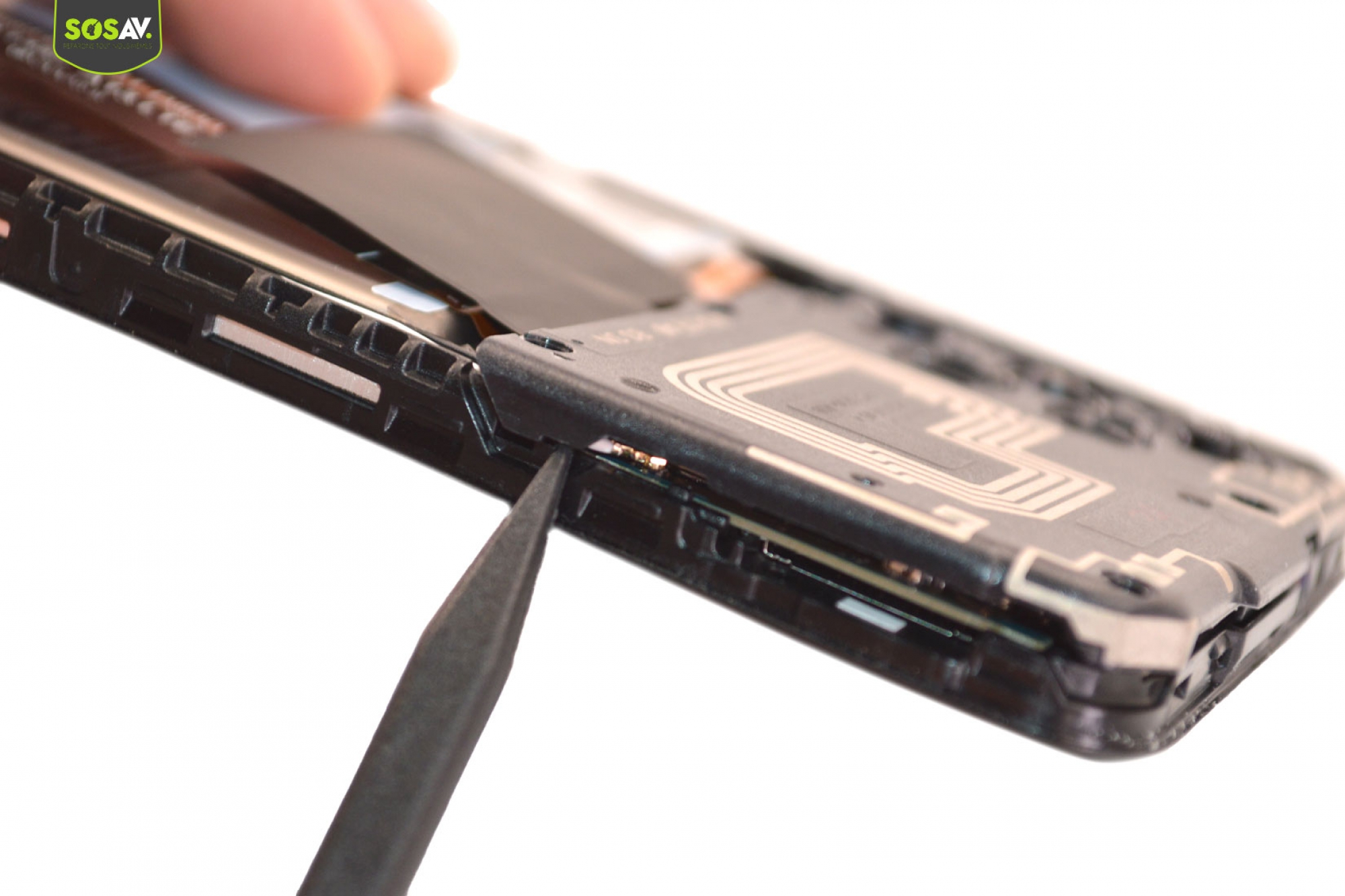 Par la suite, infiltrez la pincette sous le composant pour le décoller du châssis. Faites attention à sa petite nappe !