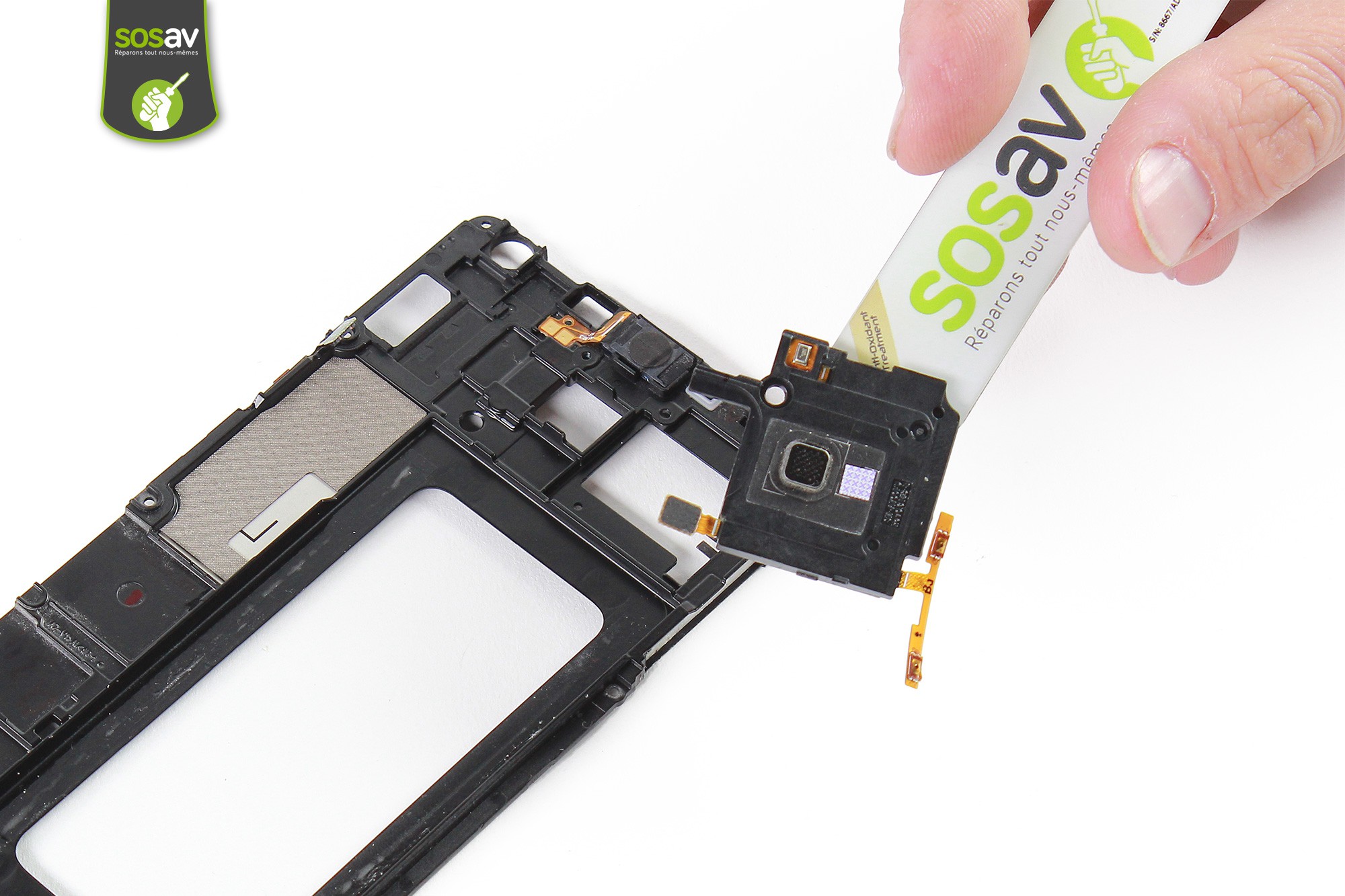 Votre Samsung Galaxy A7 est devenu muet et cela vous désaspère de ne plus pouvoir écouter vos playlists, l'entendre sonner ou simplement discuter en mode mains-libres ' A chaque problème sa solution ! Les experts de SOSav ont préparé un tuto de réparation illustré et commenté afin de vous permettre de remplacer vous-même le haut-parleur externe incluant la nappe volume afin de régler tous vos soucis à moindre prix. Tout en ayant la satisfaction d'avoir réparé seul votre smartphone !