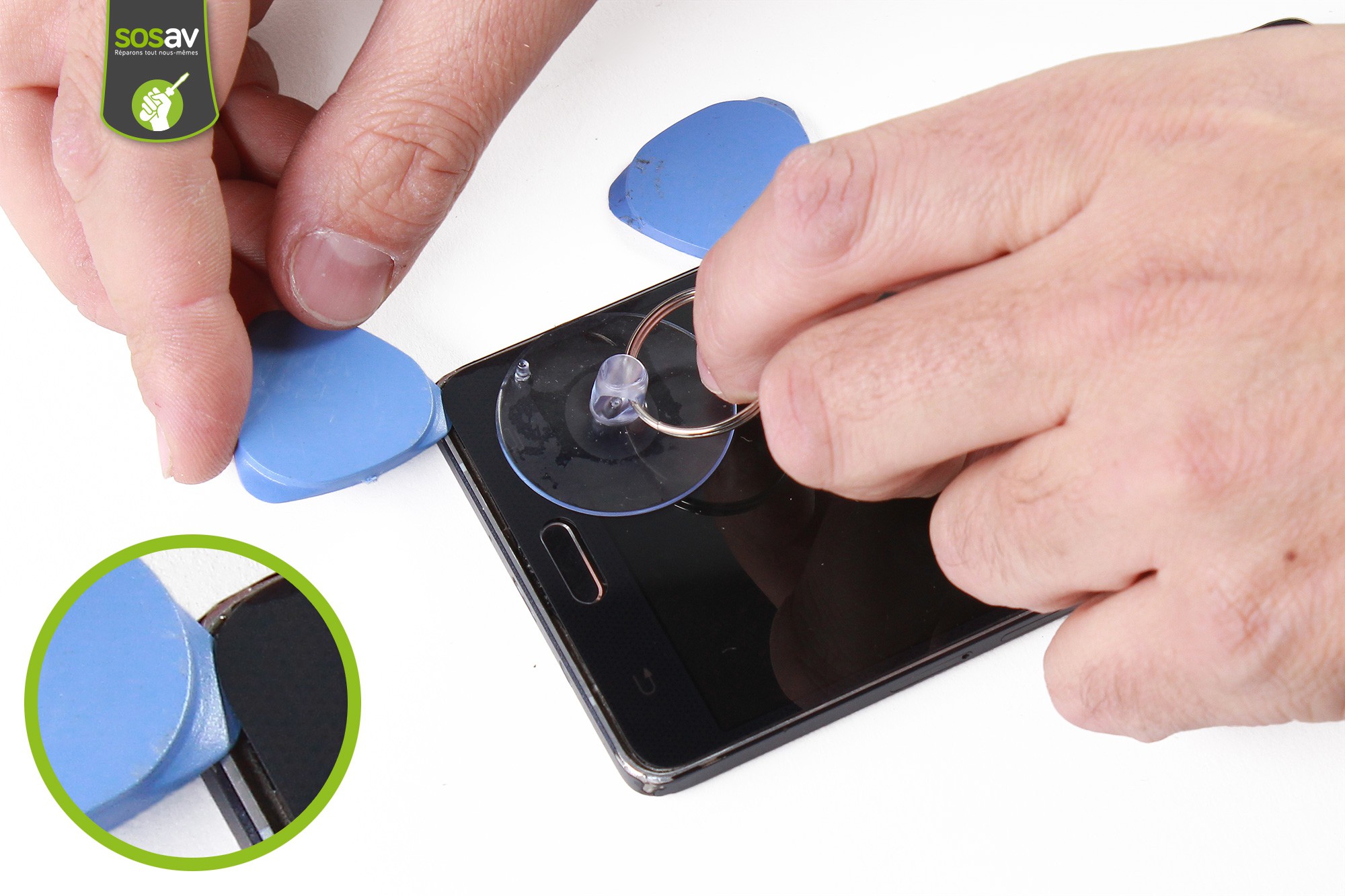 Continuez l'opération sur la partie haute de la vitre.Placez la ventouse en haut de l'écran de votre Galaxy A7, puis glissez les médiators entre le châssis et l'écran pour éviter qu'il ne se recolle.