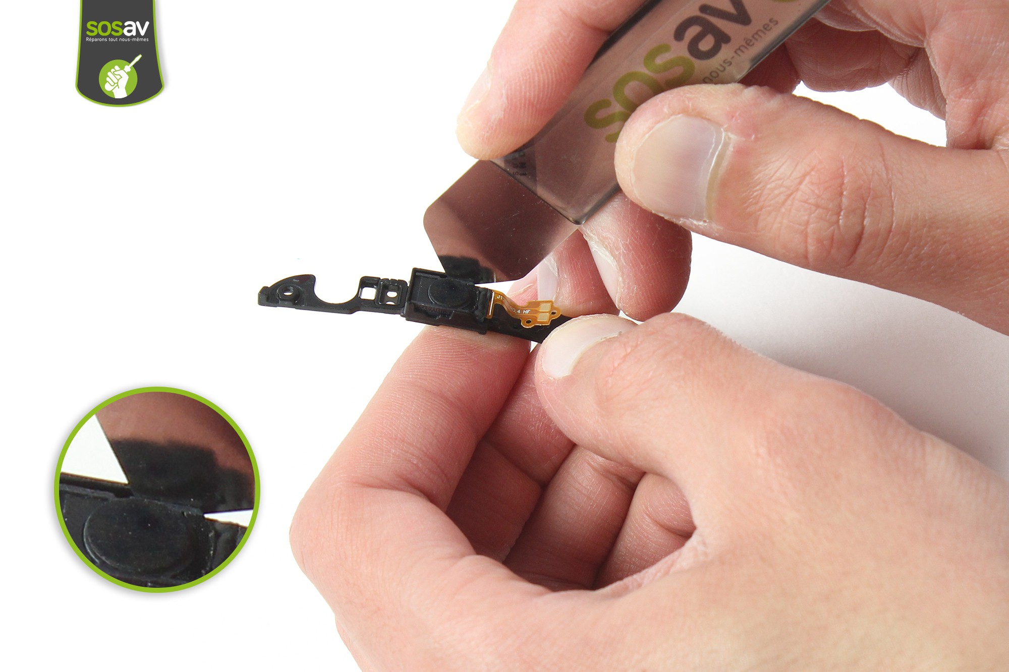 Insérez ensuite la spatule iSesamo dans l'interstice plastique supérieur-haut-parleur interne puis faites délicatement levier afin de décoller le haut-parleur interne.Procédez à son retrait.