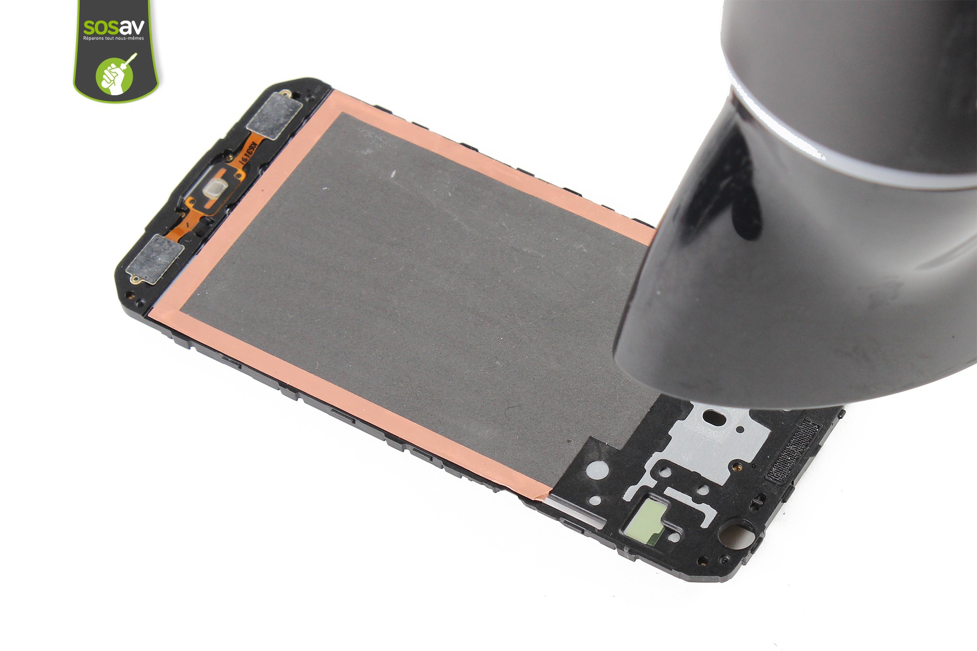 Afin de décoller l'écran, il est nécessaire de le réchauffer durant 3 à 5 minutes avec le sèche-cheveux.L'écran du Galaxy J3 2016 est très solidement collé au châssis. Nous vous suggérons de réchauffer régulièrement l'écran au fur et à mesure des étapes pour plus de simplicité. Soyez très délicats lors du décollement de l'écran, ce dernier étant très fin et par conséquent, relativement fragile et sensible, le risque de casse est très élevé.