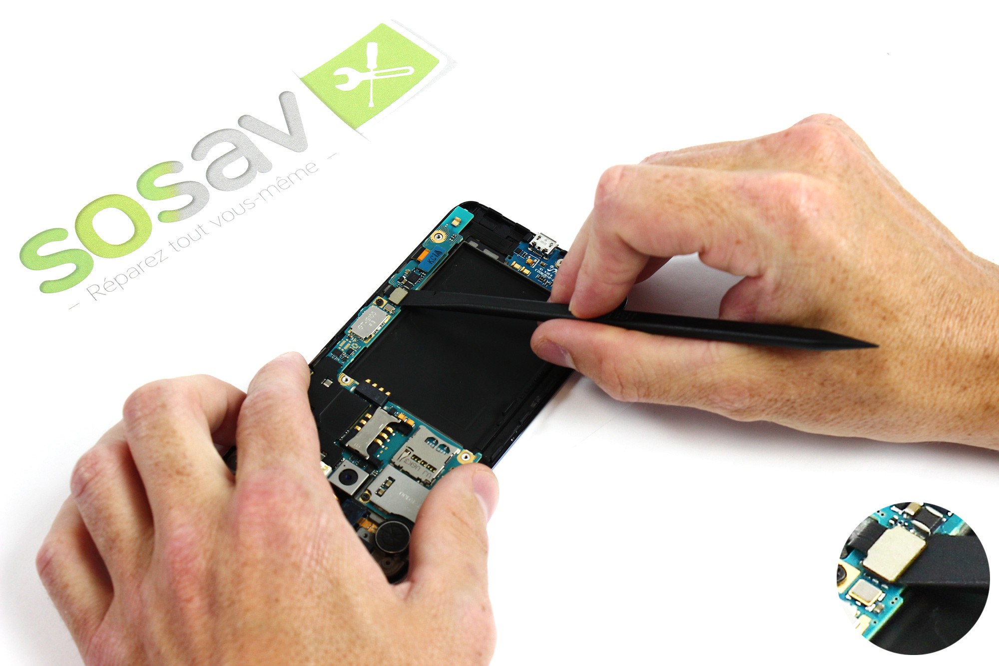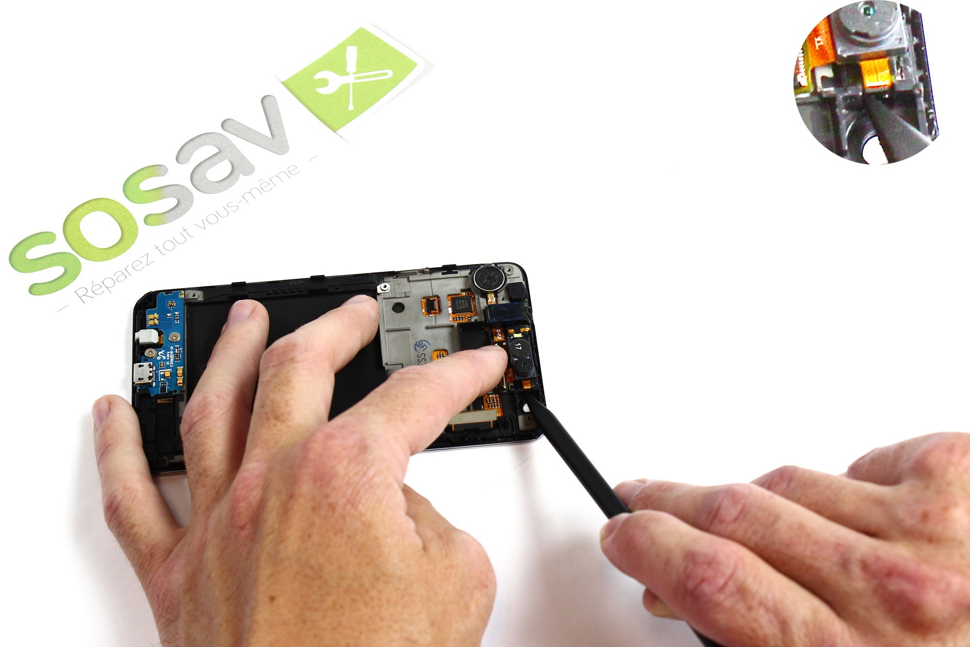 A l'aide d'une spatule en nylon, sortez délicatement la caméra avant de son emplacement comme indiqué sur la photo.