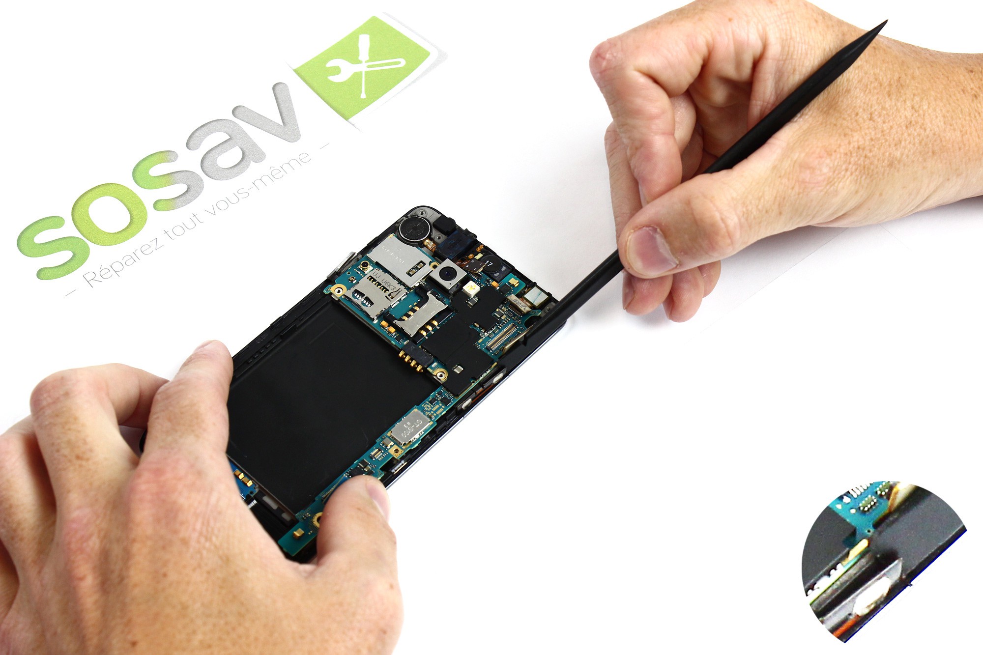 A l'aide d'une spatule en nylon, faites délicatement levier pour déconnecter la nappe de gestion de l'ensemble haut-parleur + prise jack de la carte mère.