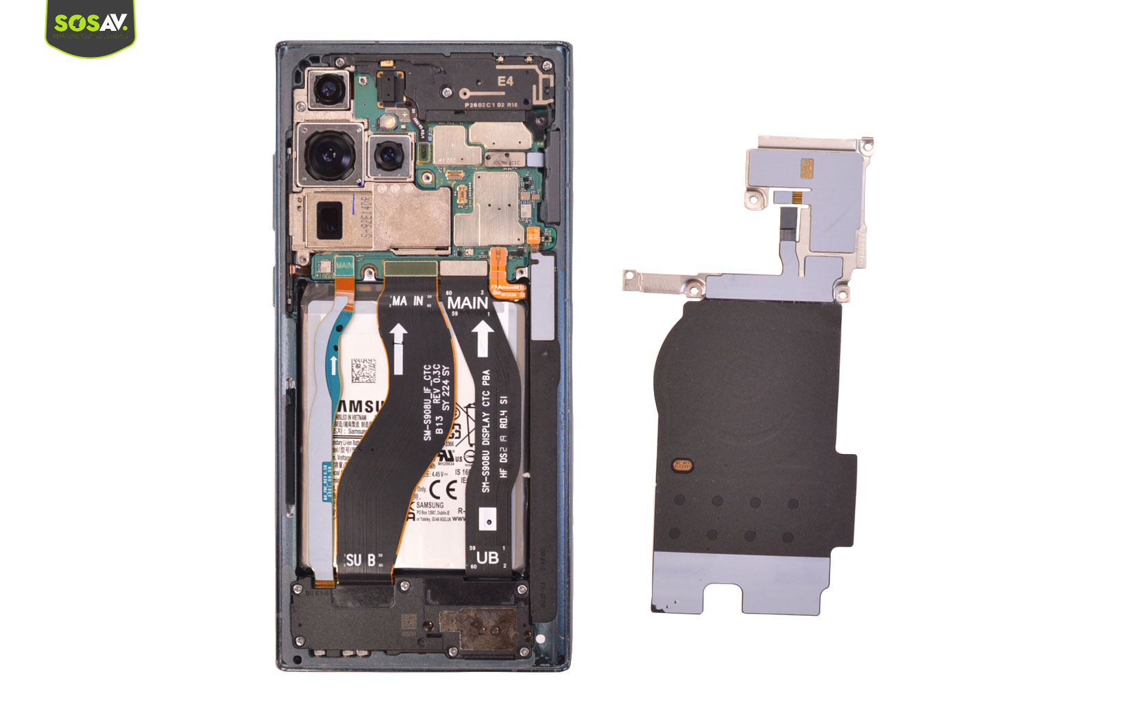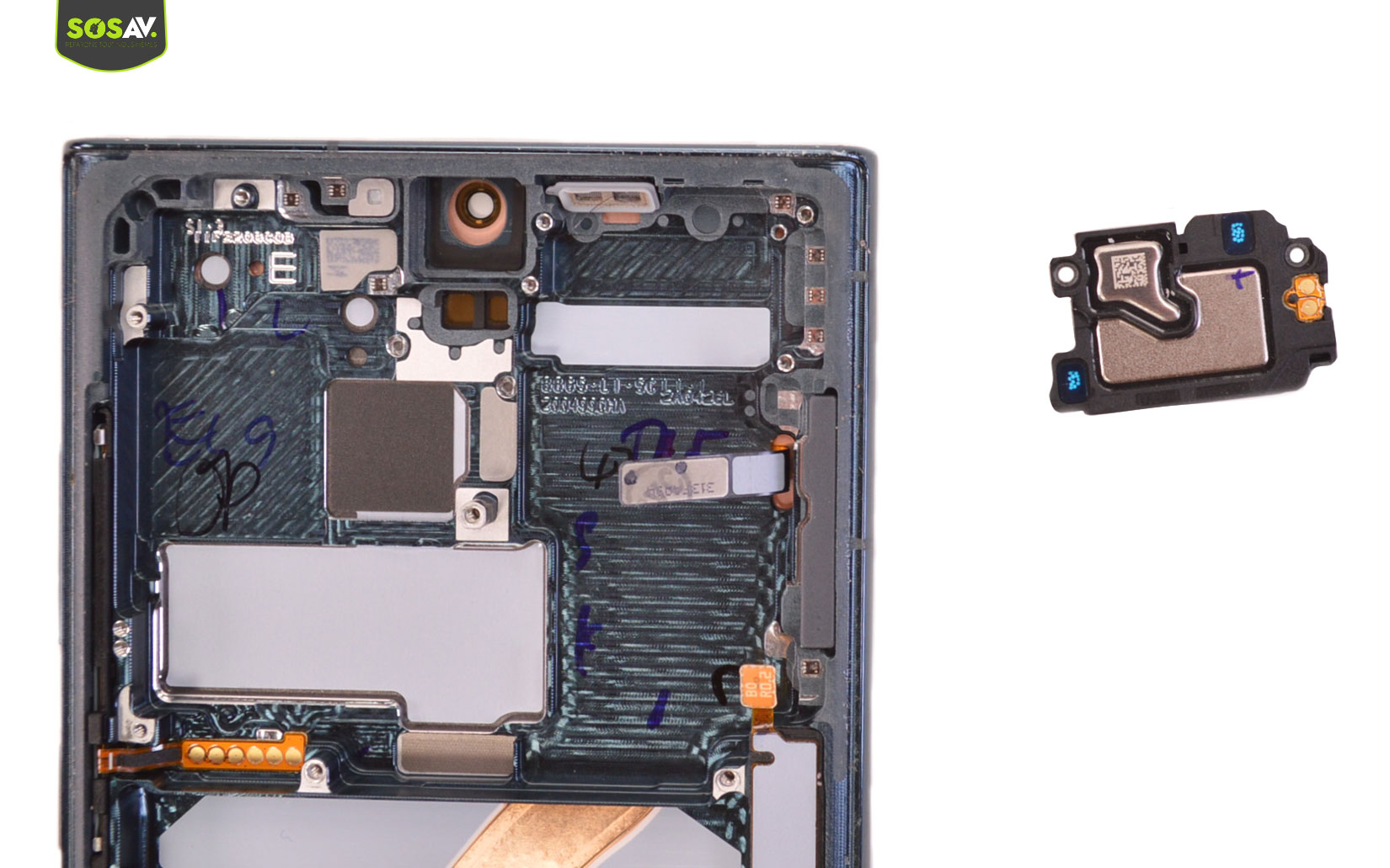 Qu'en est-il du processus de réparation du Galaxy S22 Ultra ? Eh bien, les habitués ne seront pas dépaysés car Samsung maintient ses bonnes pratiques. Comme d'habitude, il faut commencer par retirer la vitre arrière. Bien que la plupart des composants restent modulables et accessibles en cas de panne, la fragilité de la vitre arrière peut inquiéter certains utilisateurs. Il existe un risque de casse, mais en prenant son temps et en suivant les conseils des experts de SOSav dans nos guides de réparation, tout devrait bien se dérouler. Quant au reste de la réparation du Galaxy S22 Ultra, il faudra simplement faire preuve de patience. Pour remplacer la batterie du S22 Ultra, il sera nécessaire de démonter quelques éléments au préalable, mais cela ne présente pas de difficultés majeures.