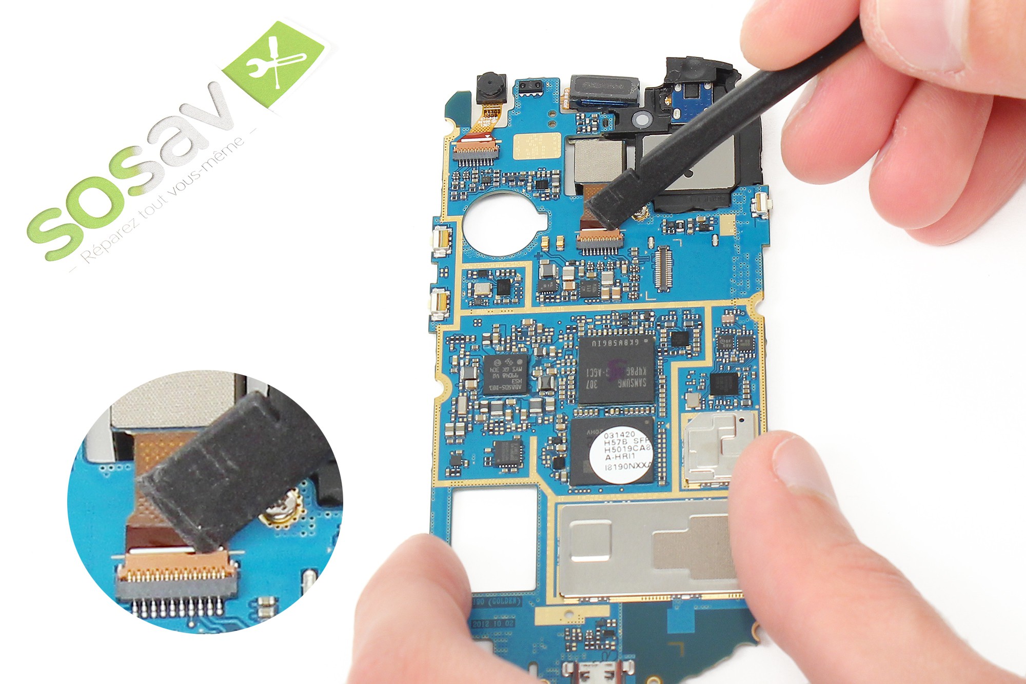 Reprenez la spatule en nylon pour déconnecter les deux nappes localisées en bas de la carte mère.