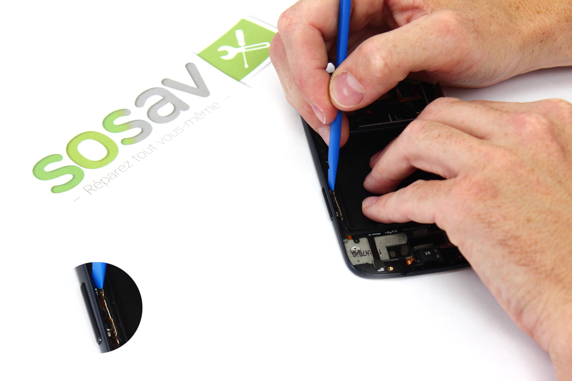 Insérez désormais une spatule en nylon entre le bloc "haut-parleur + prise jack" et le châssis du Galaxy S3 comme indiquée sur la première photo.
