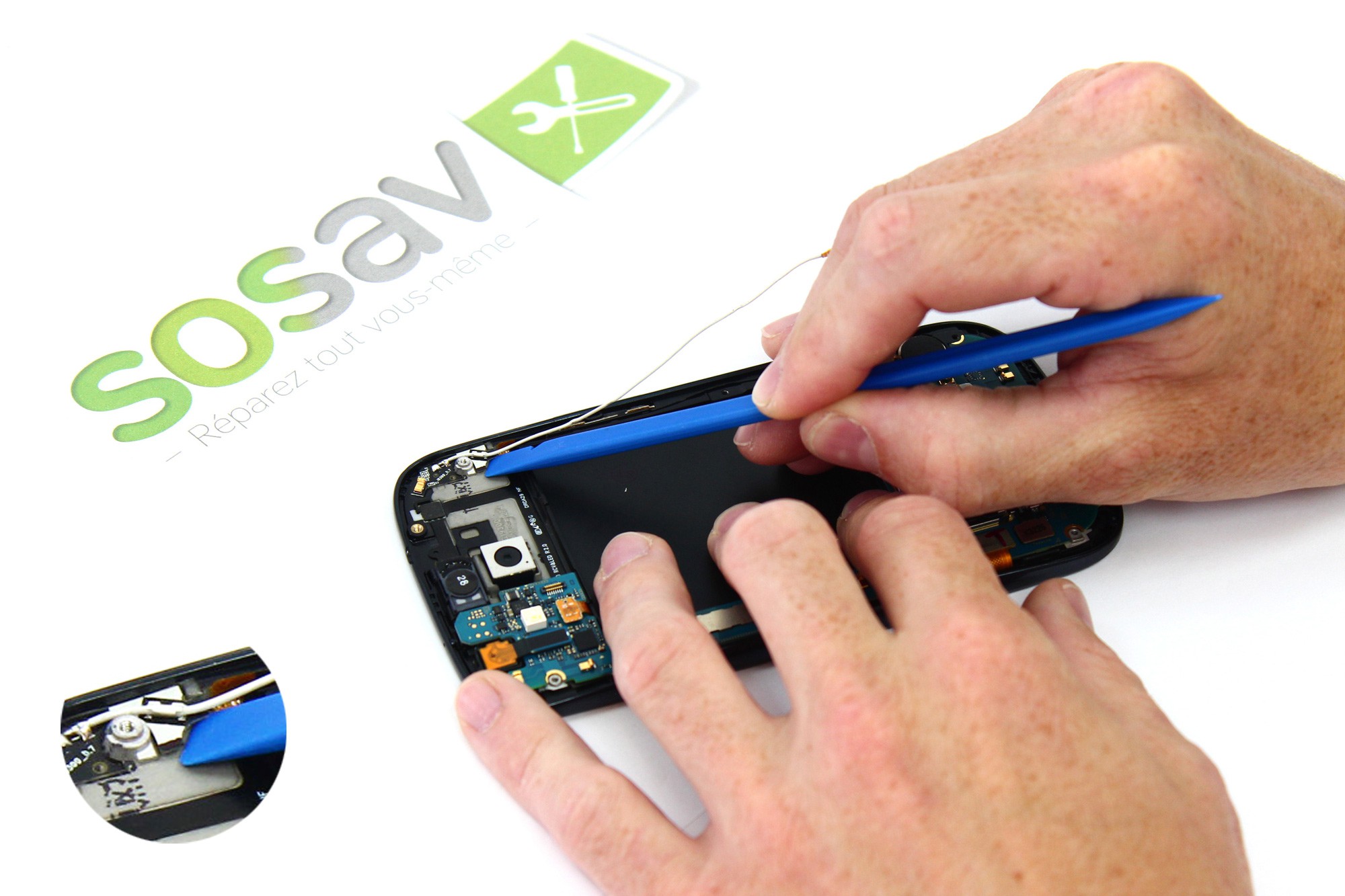Insérez désormais une spatule en nylon entre le bloc "haut-parleur + prise jack" et le châssis du Galaxy S3 comme indiquée sur la première photo.