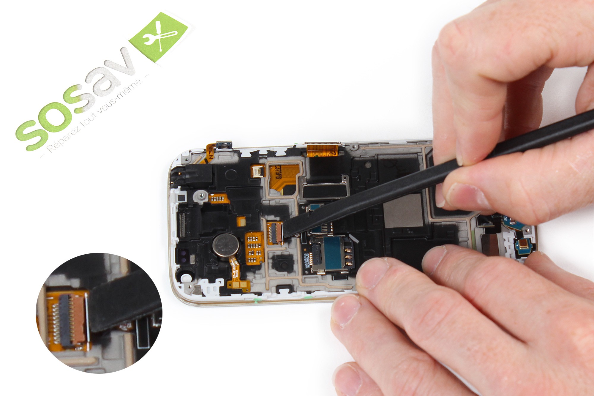 Avec la spatule en nylon, faites délicatement levier afin de déclipser le connecteur reliant le LCD à la carte-mère de votre Galaxy S4 Mini.