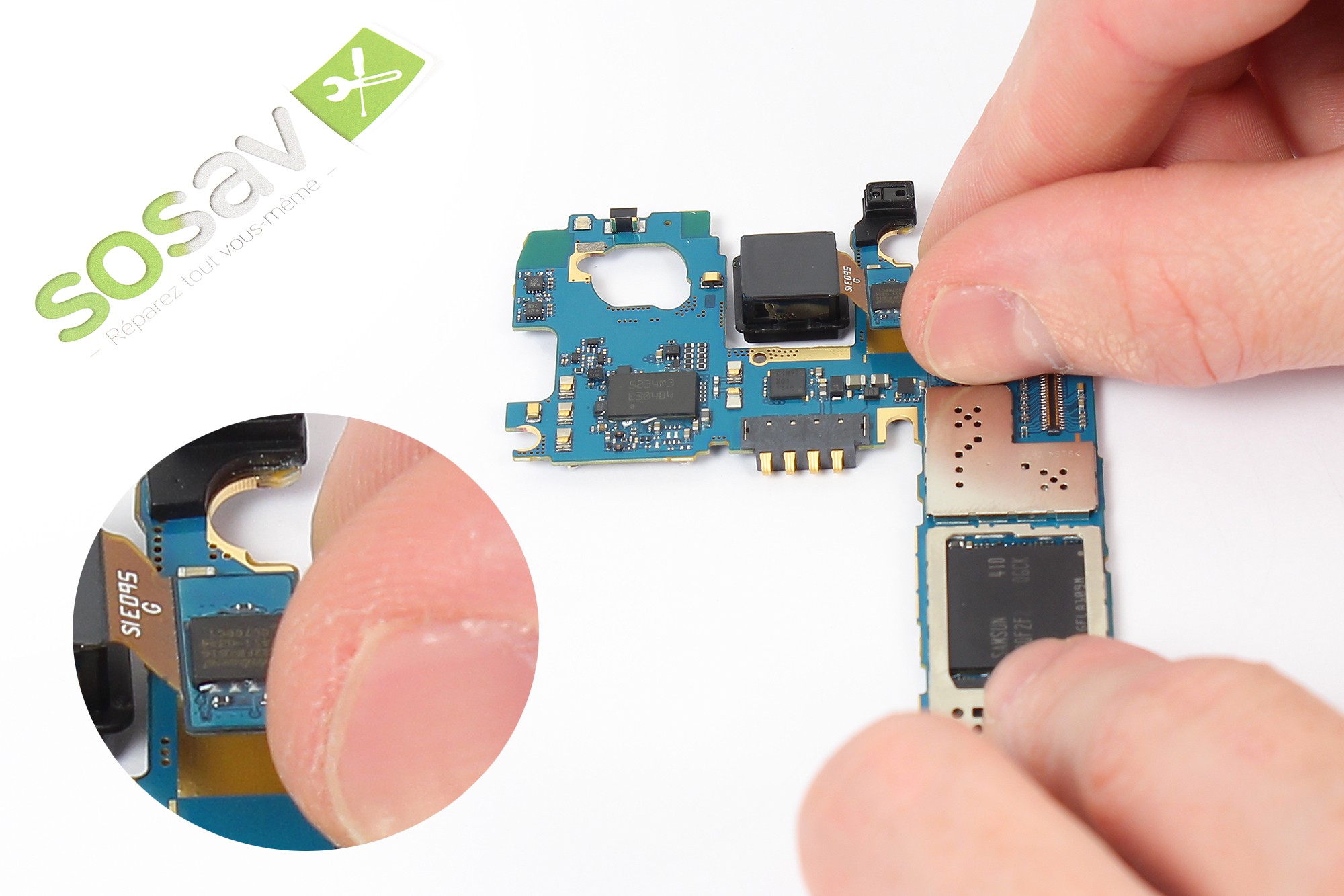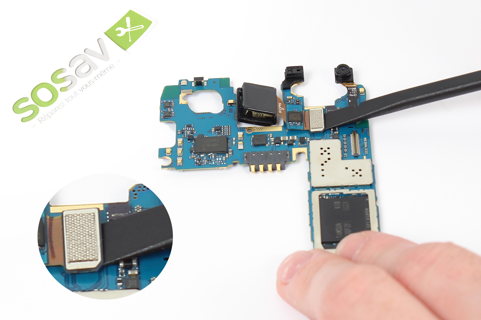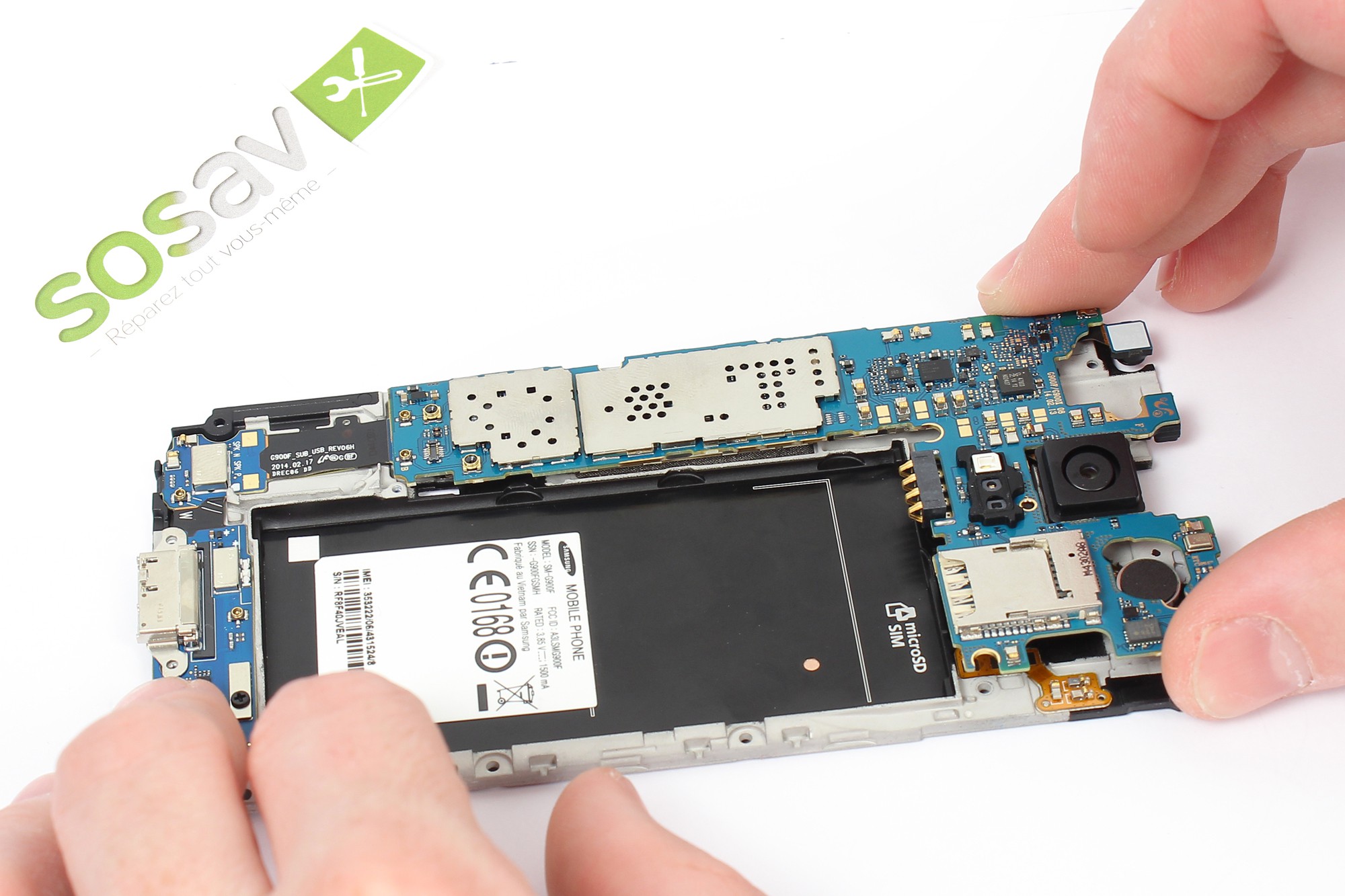 Saisissez désormais la carte-mère de votre Galaxy S5 sur la partie haute.