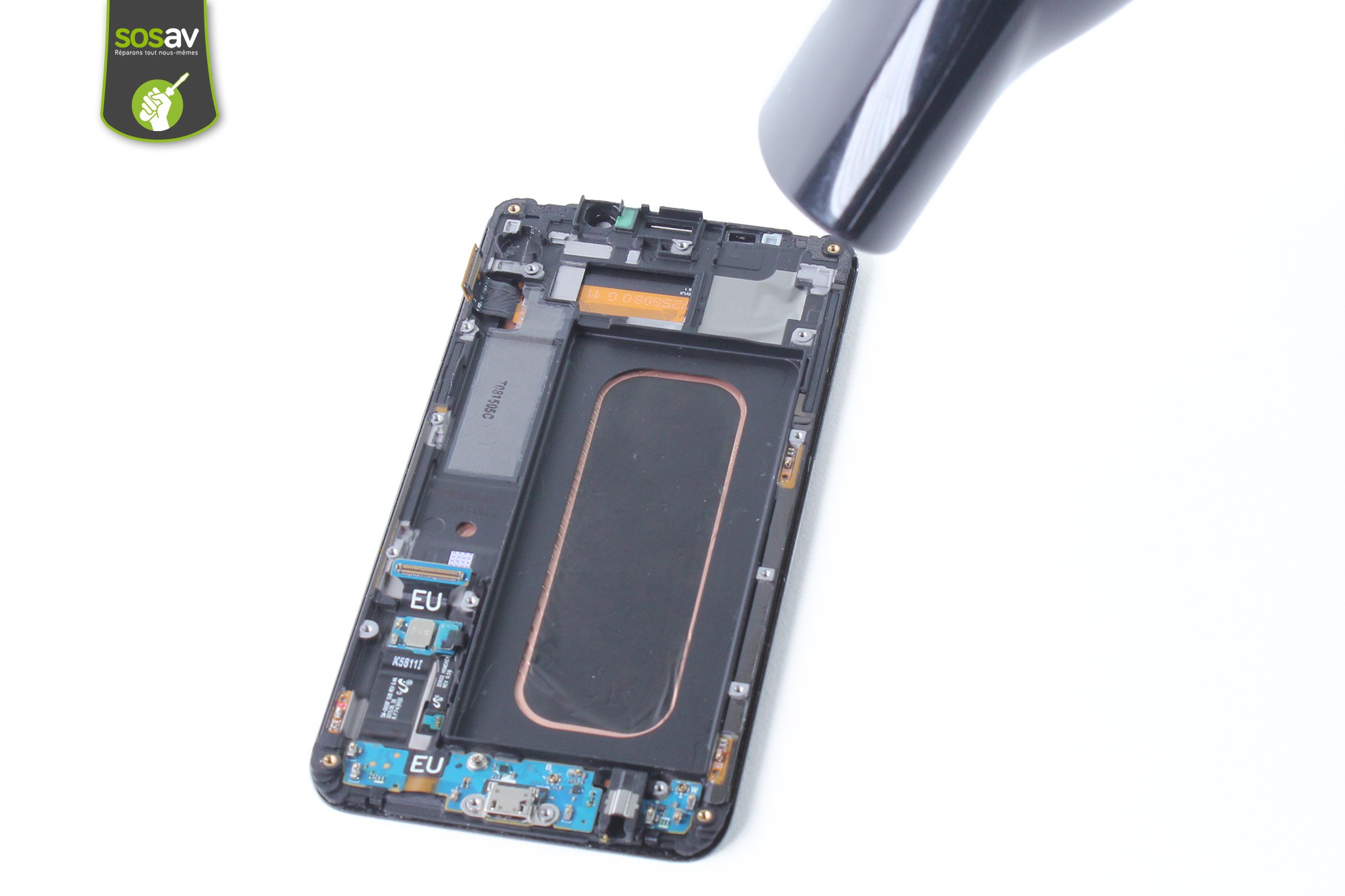 La vitre arrière du Galaxy S6 Edge + est collée à son châssis. Il est nécessaire de "ramollir" la colle à l'aide d'un sèche-cheveux. Pour ceci, réchauffez les parties inférieure et supérieure de la façade arrière durant 20 à 30 sec maximum.Ne chauffez pas plus de 20 à 30 secondes la façade arrière de votre S6 Edge +. Vous risqueriez d'endommager la nappe NFC / chargeur à induction.