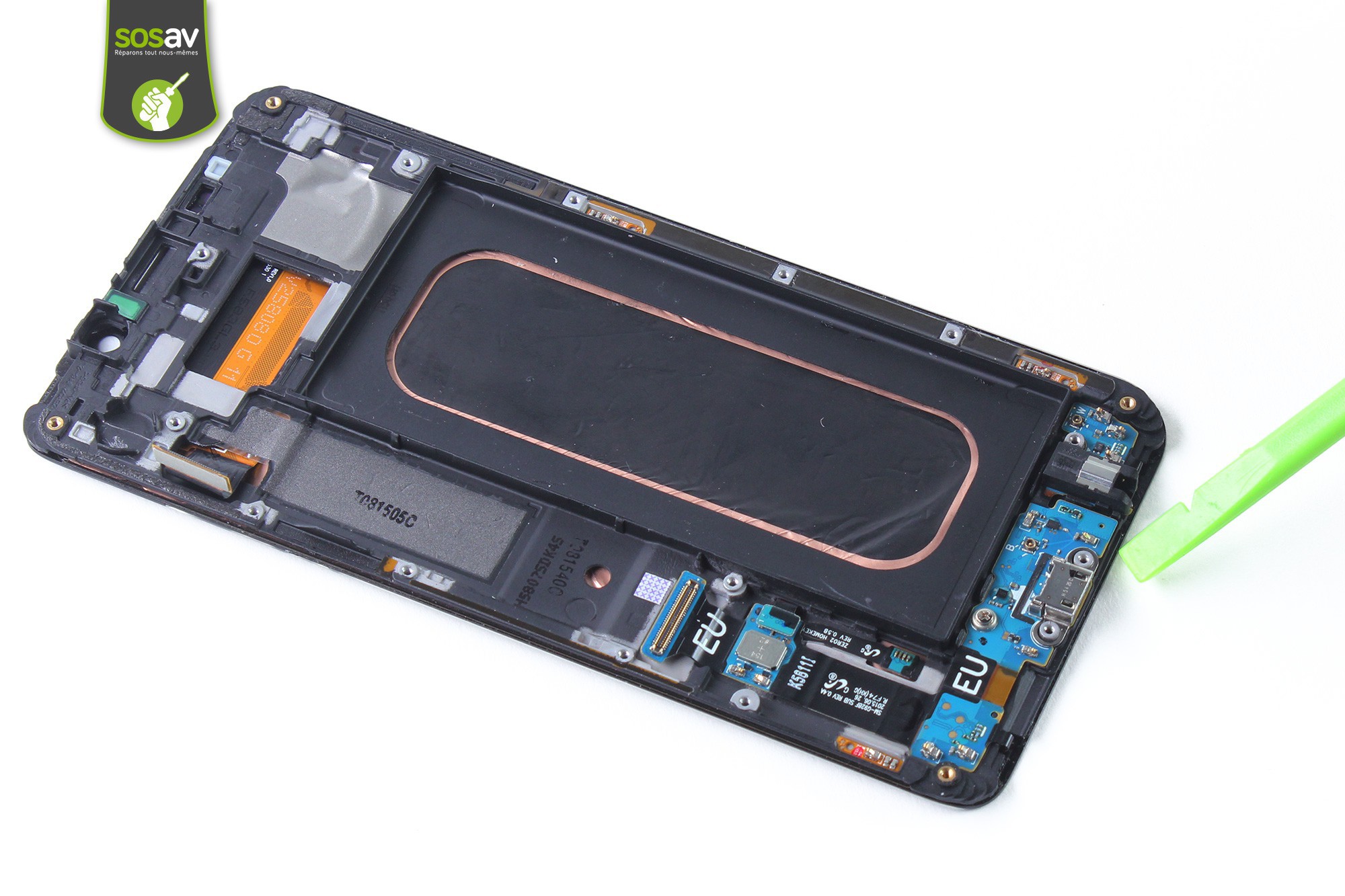 Déconnectez ensuite la nappe de liaison du connecteur de charge en utilisant la spatule en nylon.Saisissez la carte mère puis retirez-la du téléphone.La carte mère de votre Galaxy S6 Edge + est désormais démontée.