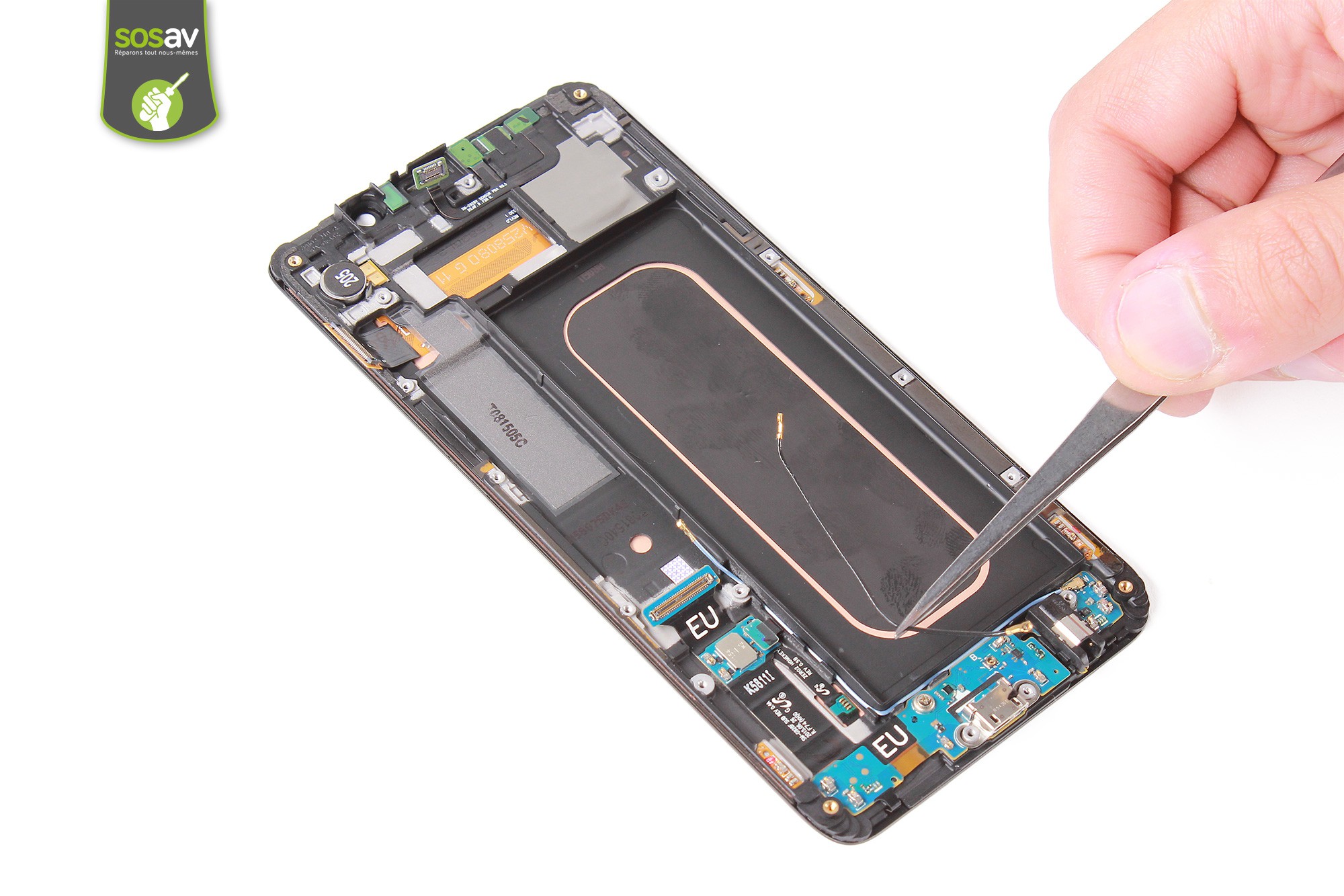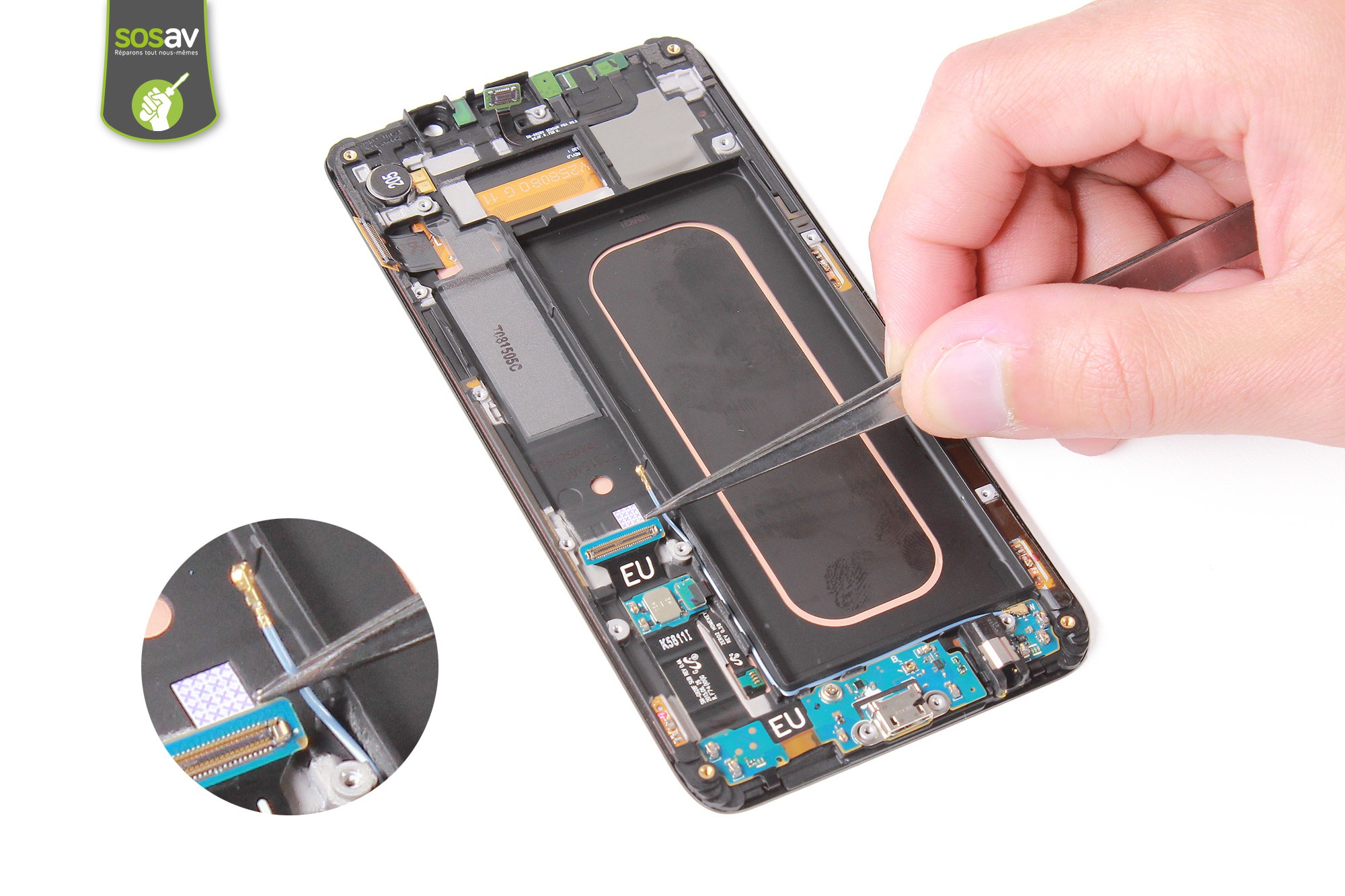 Saisissez ensuite le câble d'interconnexion à l'aide de la pince puis retirez-le.Le câble d'interconnexion GSM de votre Galaxy S6 Edge + est désormais démonté.