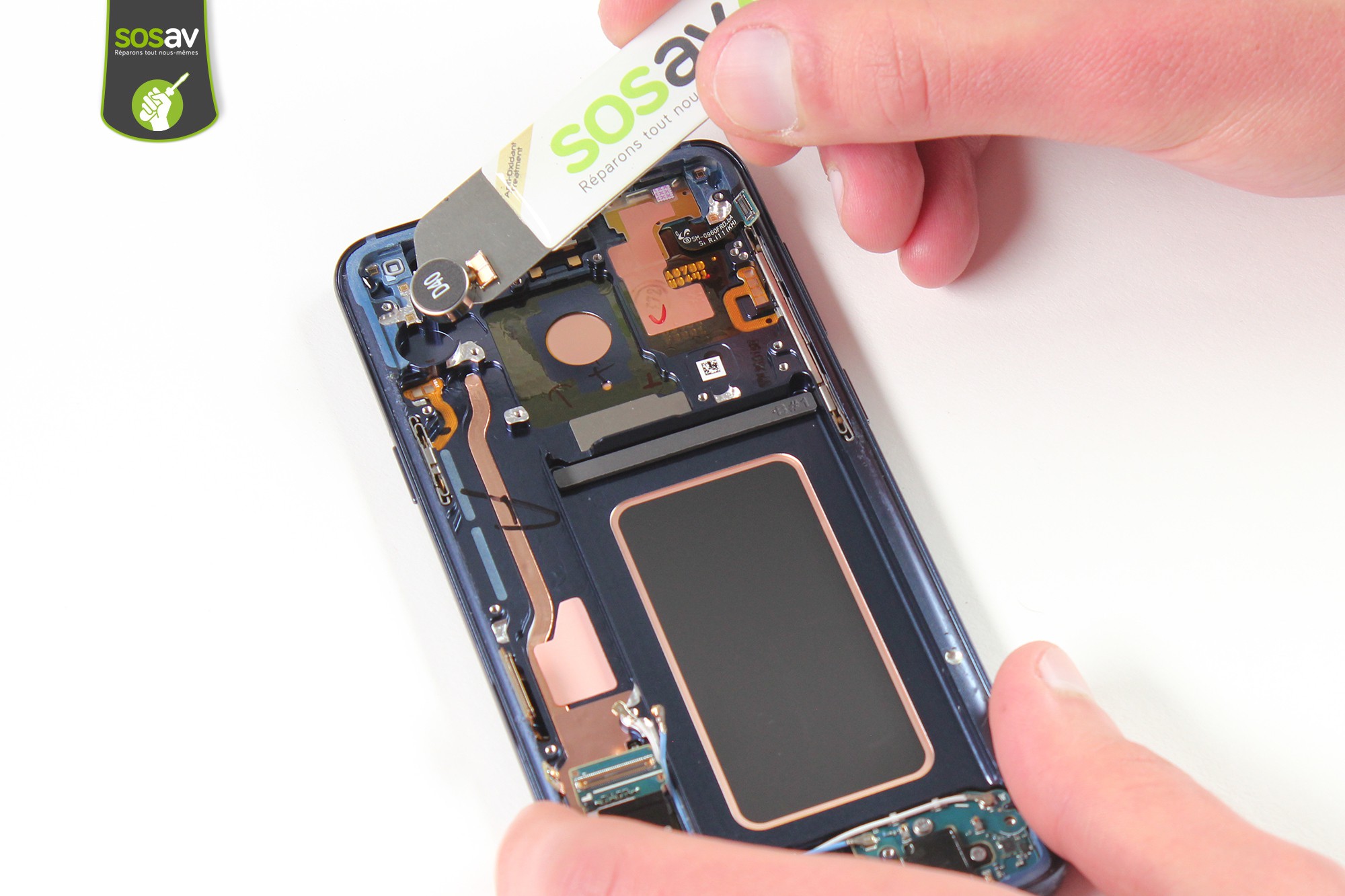Nous retrouvons une nouvelle fois le concept de démontage du téléphone par la vitre arrière, concept introduit depuis le Galaxy S6 et qui fut toujours repris jusqu'à présent.Nous n’apprécions pas vraiment cette méthode car le risque de casse reste élevé, notamment chez les personnes n’étant pas habituées à la réparation. Cela améliore l’esthétique du téléphone mais au prix d’une grande fragilité et de rayures au fil du temps.Samsung refuse encore et toujours de rendre amovibles les batteries de ses téléphones comme ce fut le cas pour beaucoup de ses modèles.L’étanchéité du téléphone n’est pas une excuse : le Galaxy Xcover 3 est un smartphone étanche à l’eau et dispose d’une batterie amovible !Le démontage de la vitre arrière nous à demandé l’utilisation d’un sèche-cheveux, d’une spatule en nylon et de médiators. Tout s’est fait sans casse.A l’image du S8+, il faut faire attention lors du démontage car la nappe du connecteur d'empreinte est encore connectée à la carte mère.