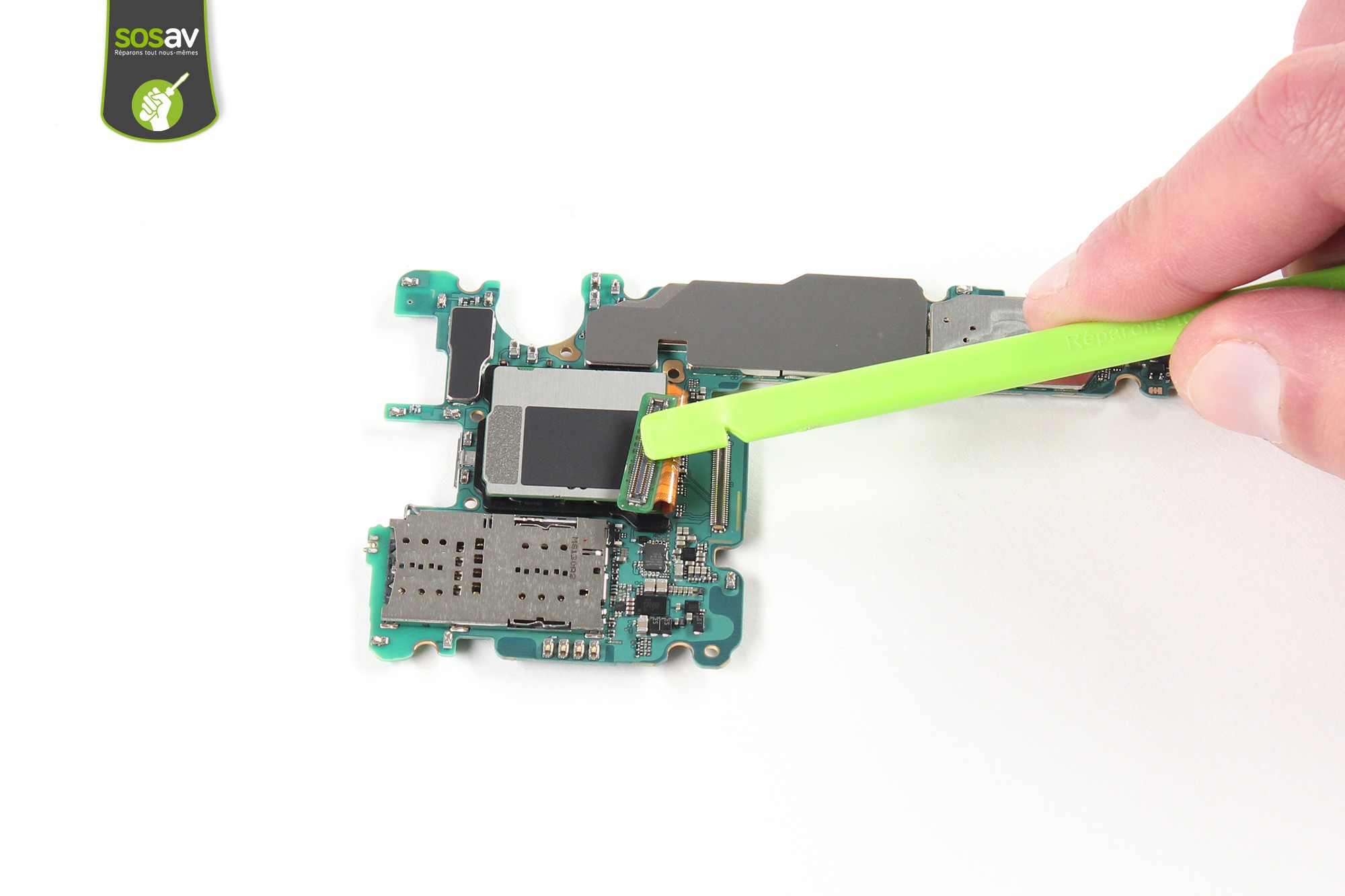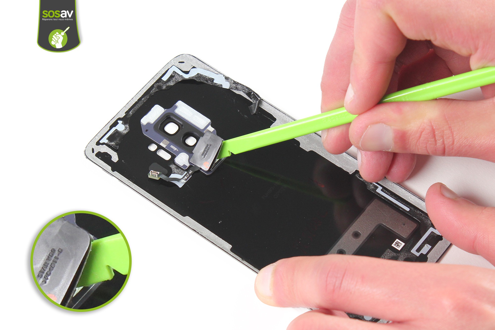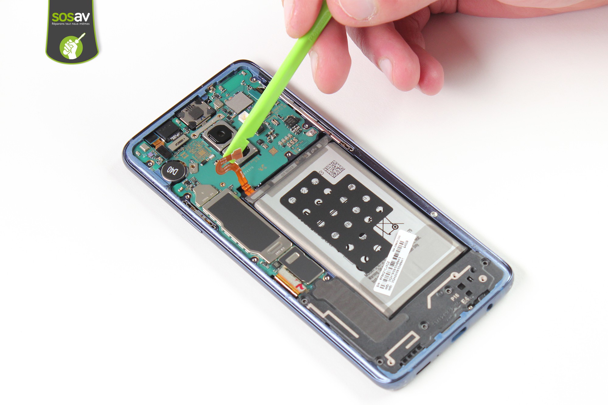 Le retrait du capteur d'empreinte reste simple à l'aide d'une spatule en nylon (ou iSesamo, c'est au choix !)Les connecteurs des capteurs d'empreinte du S8+ et S9+ restent proches sans toutefois être identiques.
