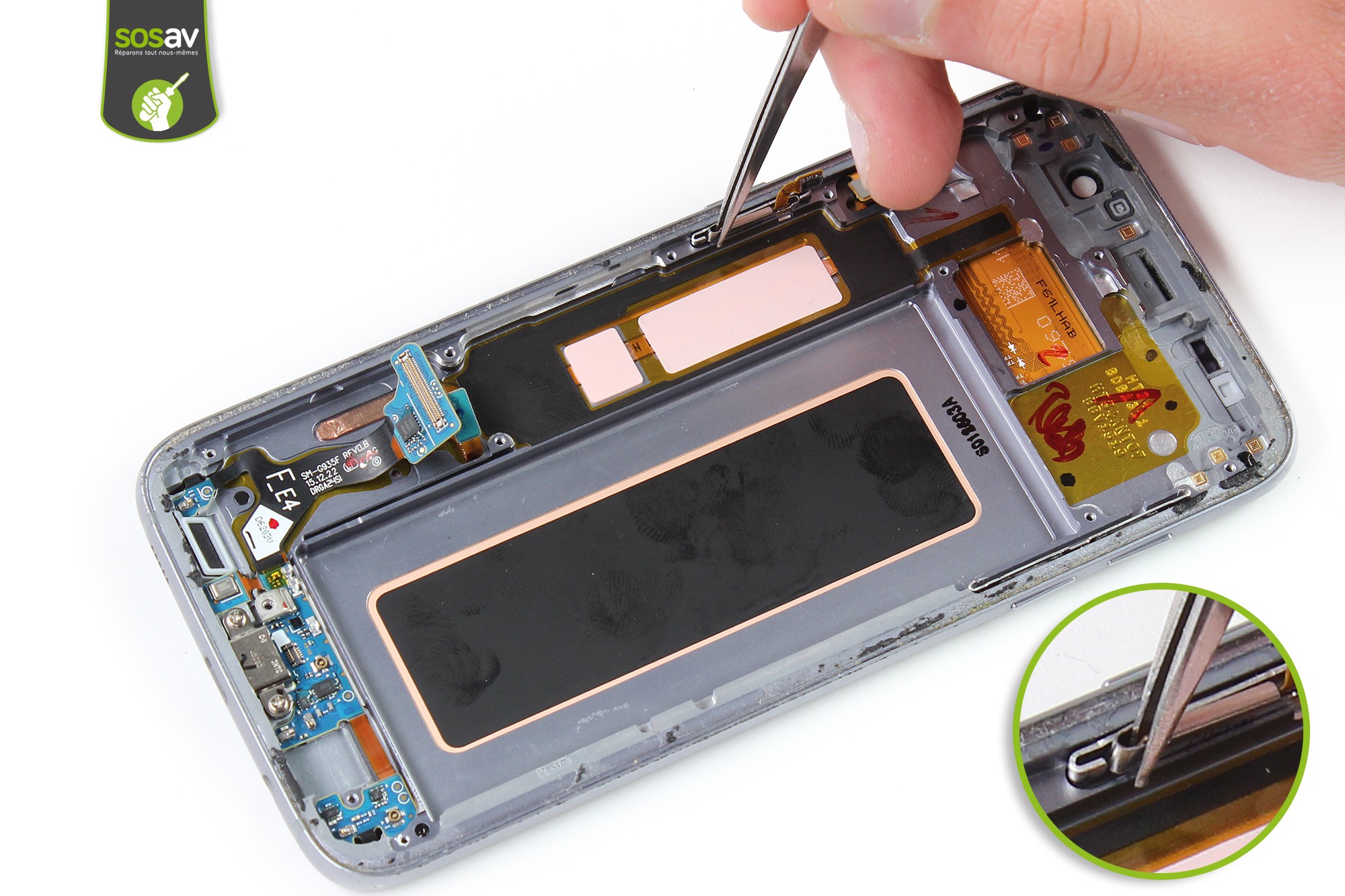 Saisissez ensuite délicatement l'antenne NFC puis retirez-la à l'aide de la pince.Procédez ensuite à son retrait.L'antenne NFC de votre Galaxy S7 Edge est désormais démontée.