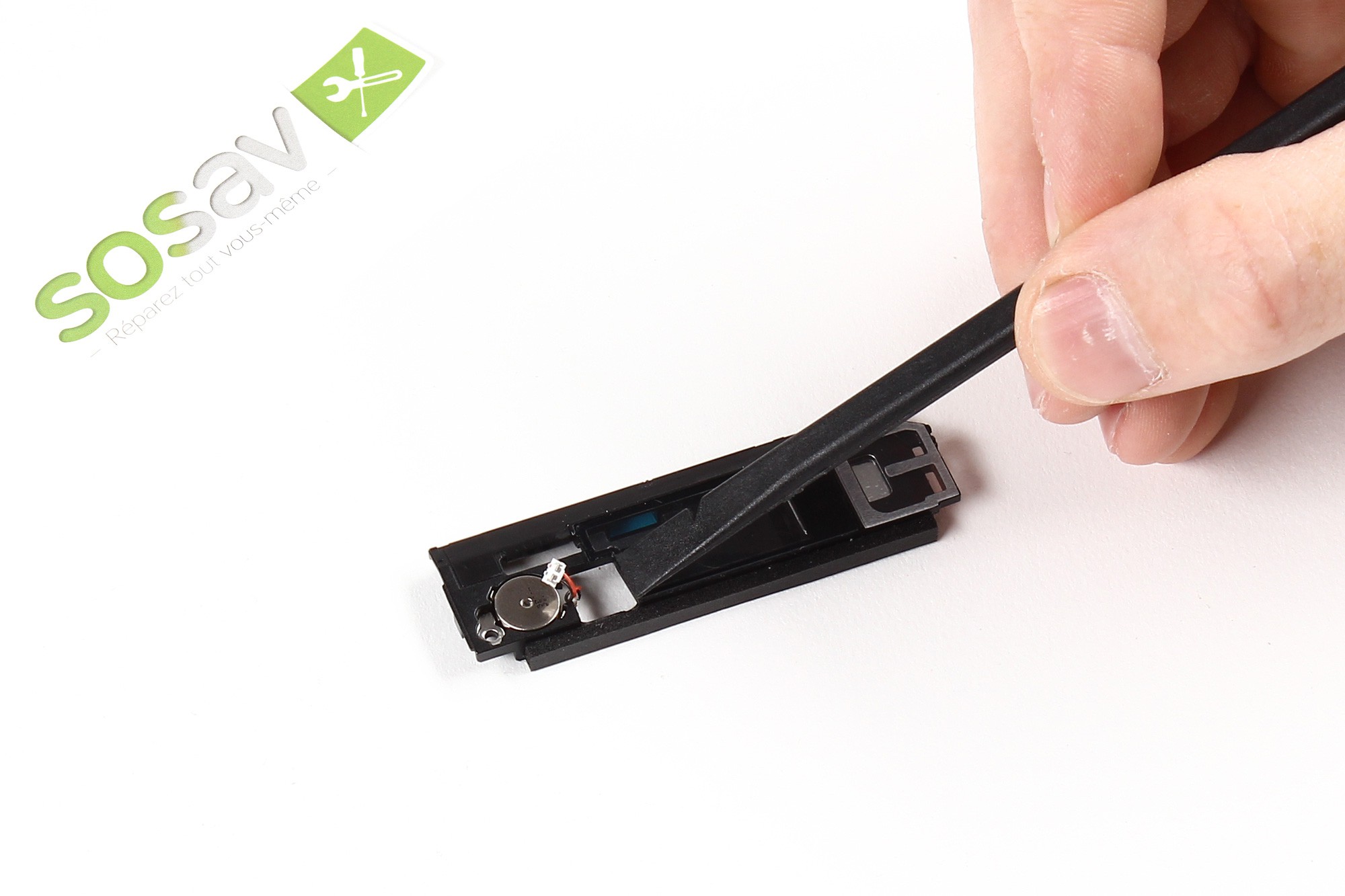 Avec la pointe de la spatule, sortez le connecteur blanc du vibreur de son emplacement.