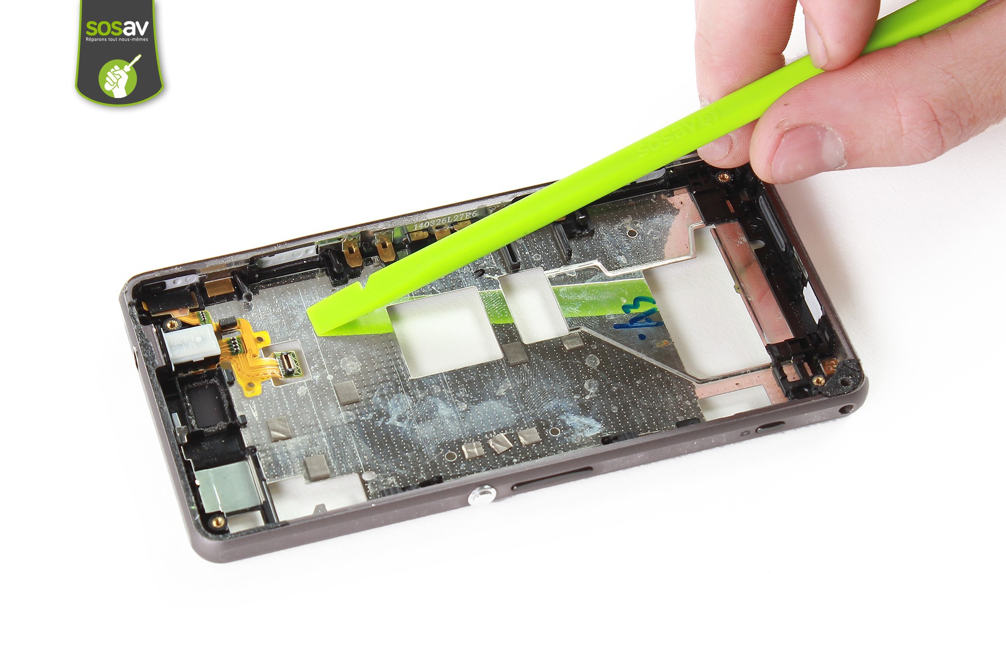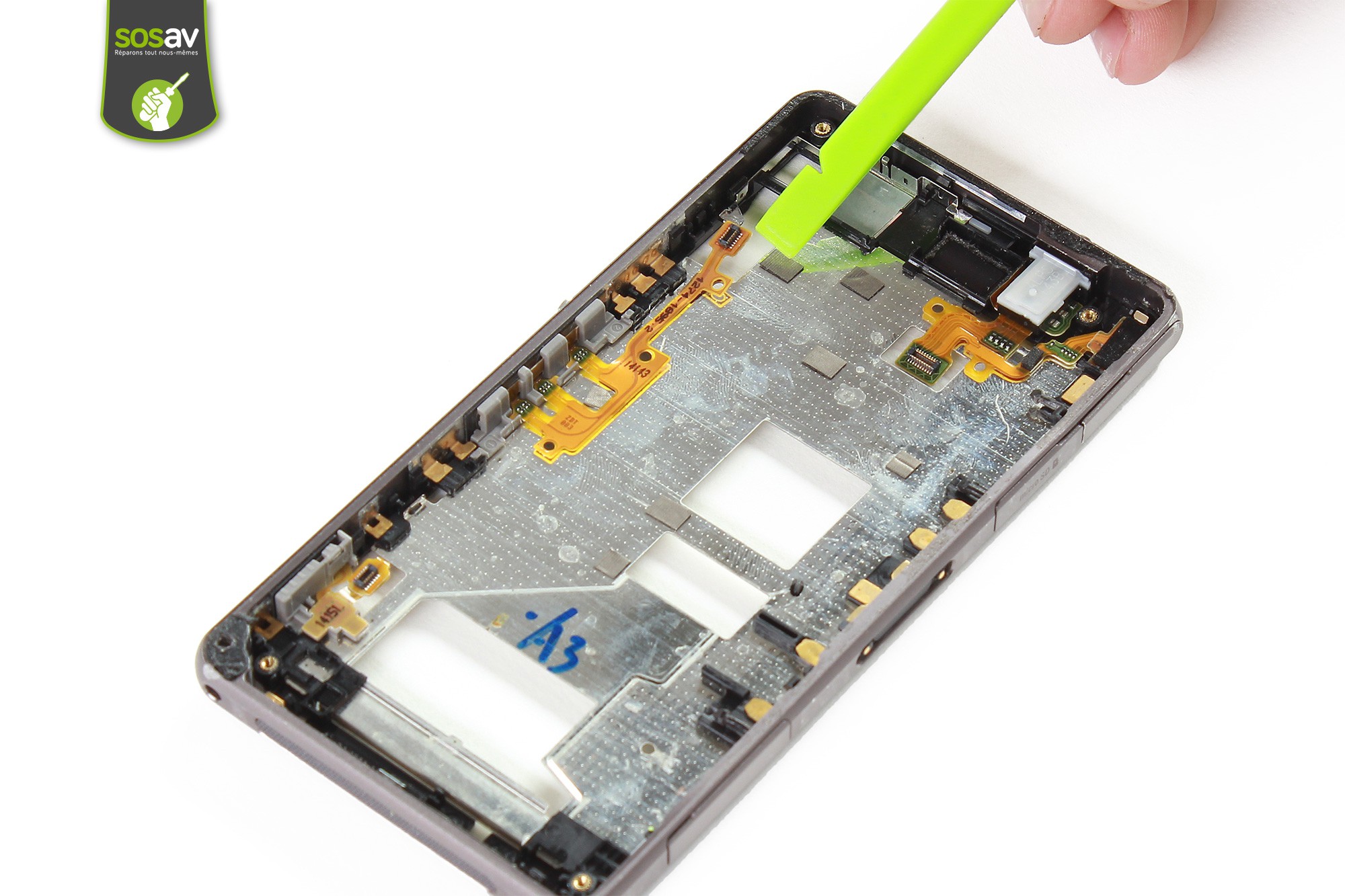 Toujours avec la spatule en nylon, décollez très légerement la nappe du bouton power + volume.
