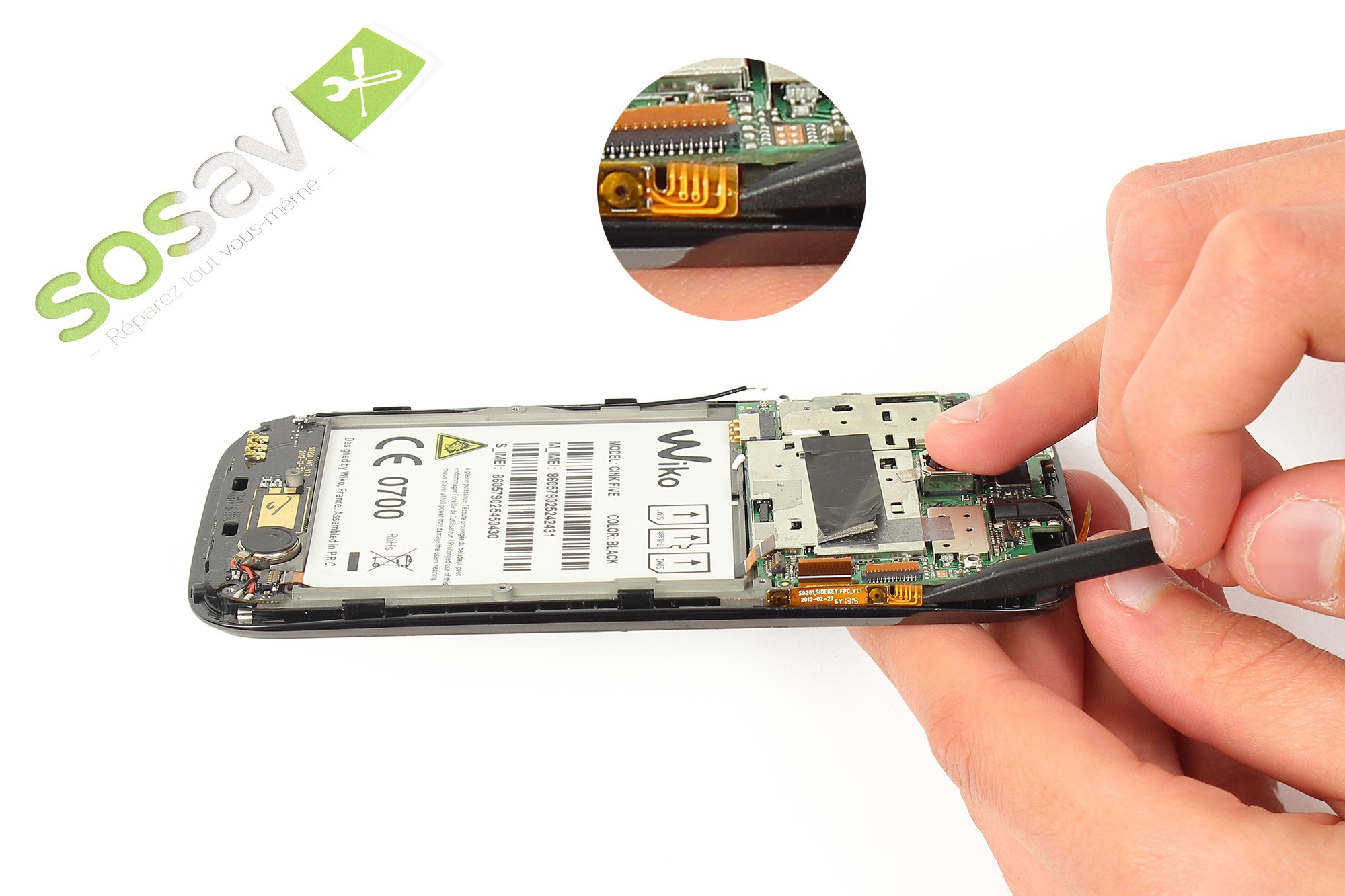 La nappe du lecteur SIM & micro SD est attachée à la carte mère grâce à un connecteur de type FPC. Afin de pouvoir la retirer, il faut auparavant faire levier sur le petit loquet comme montré sur la photo. Ce loquet doit être soulevé à 90° avant de tenter d'ôter la nappe.