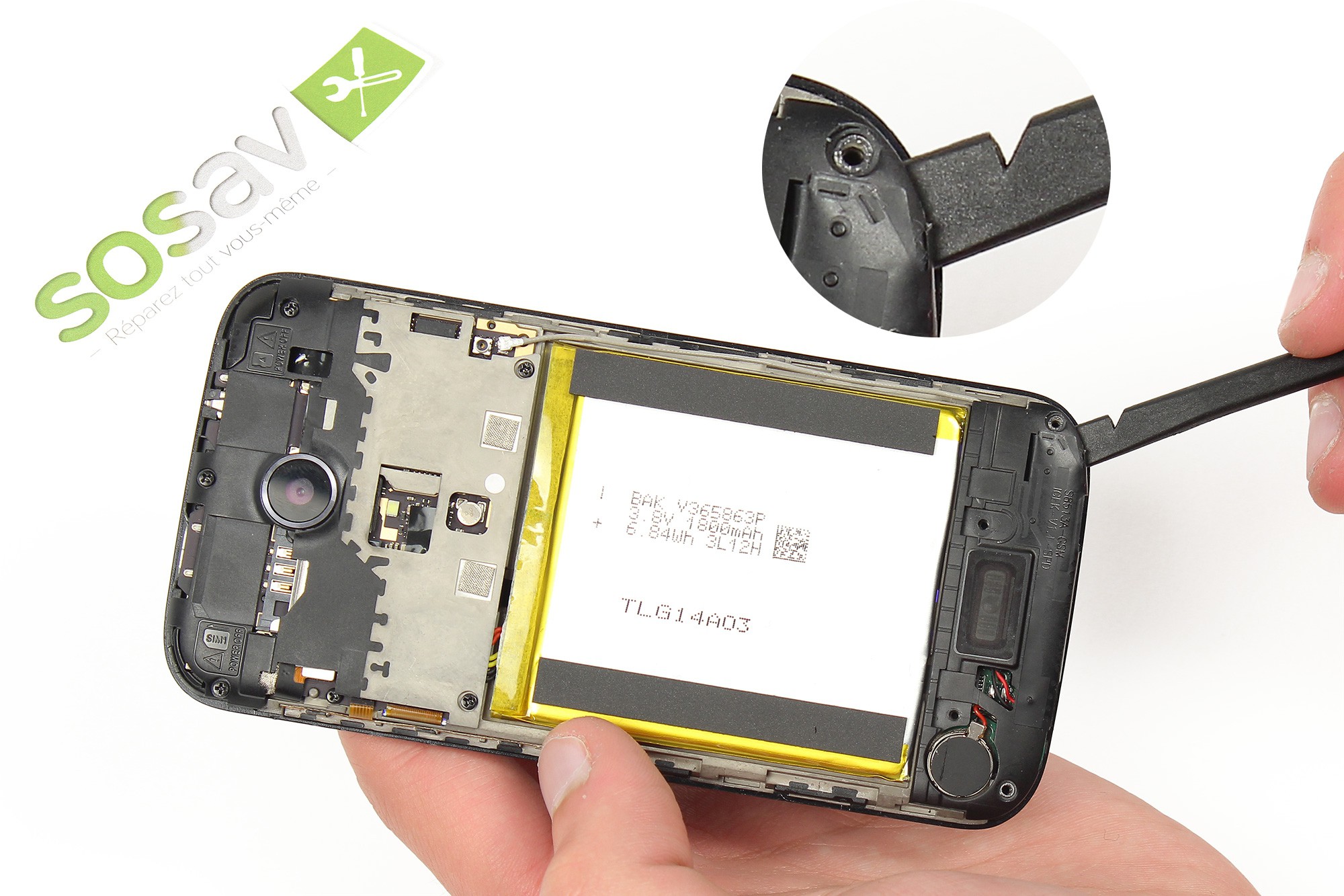 Reprenez la spatule en nylon afin de déplacer le plastique arrière comprenant le haut-parleur externe et l'antenne du téléphone.