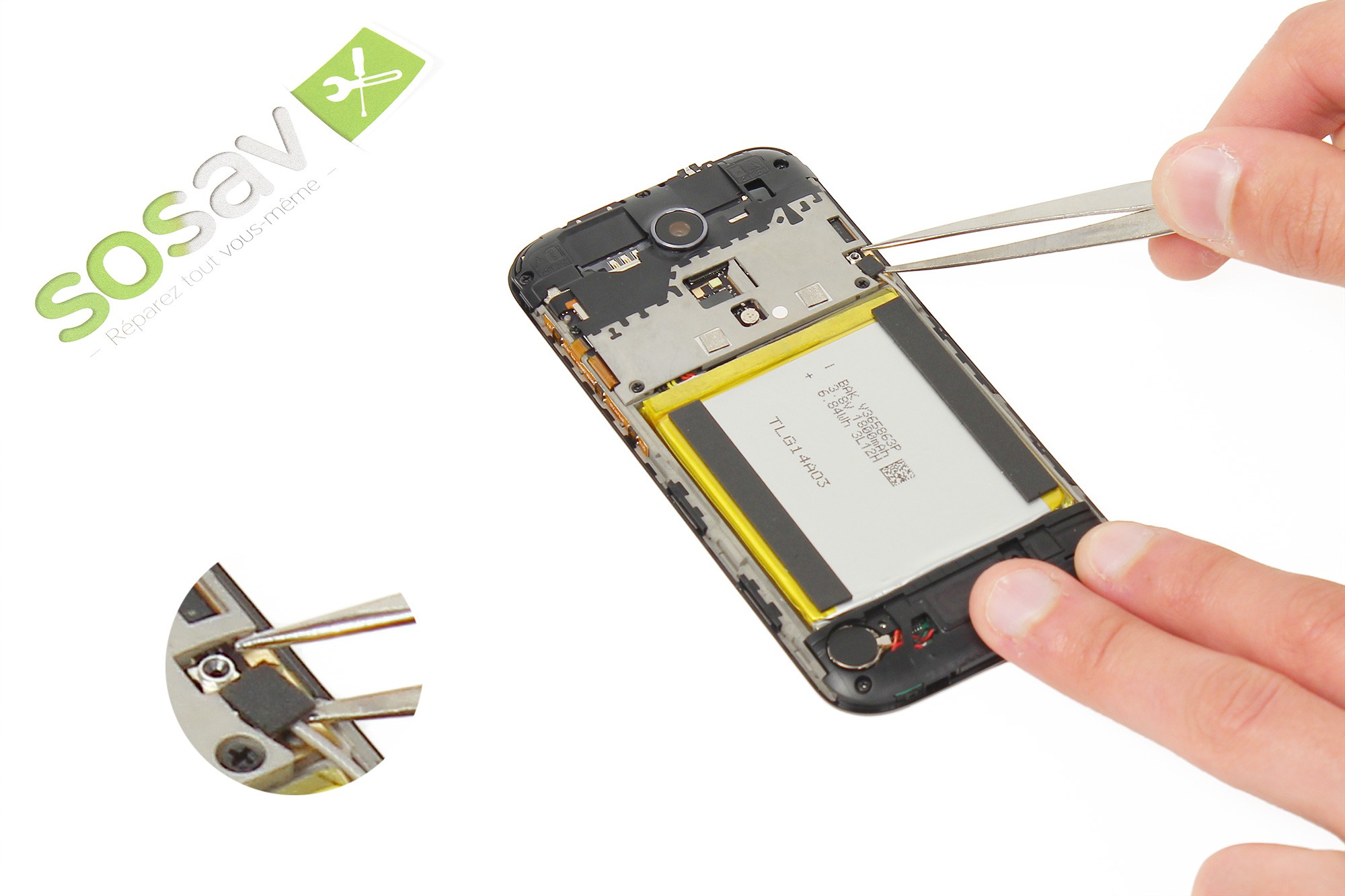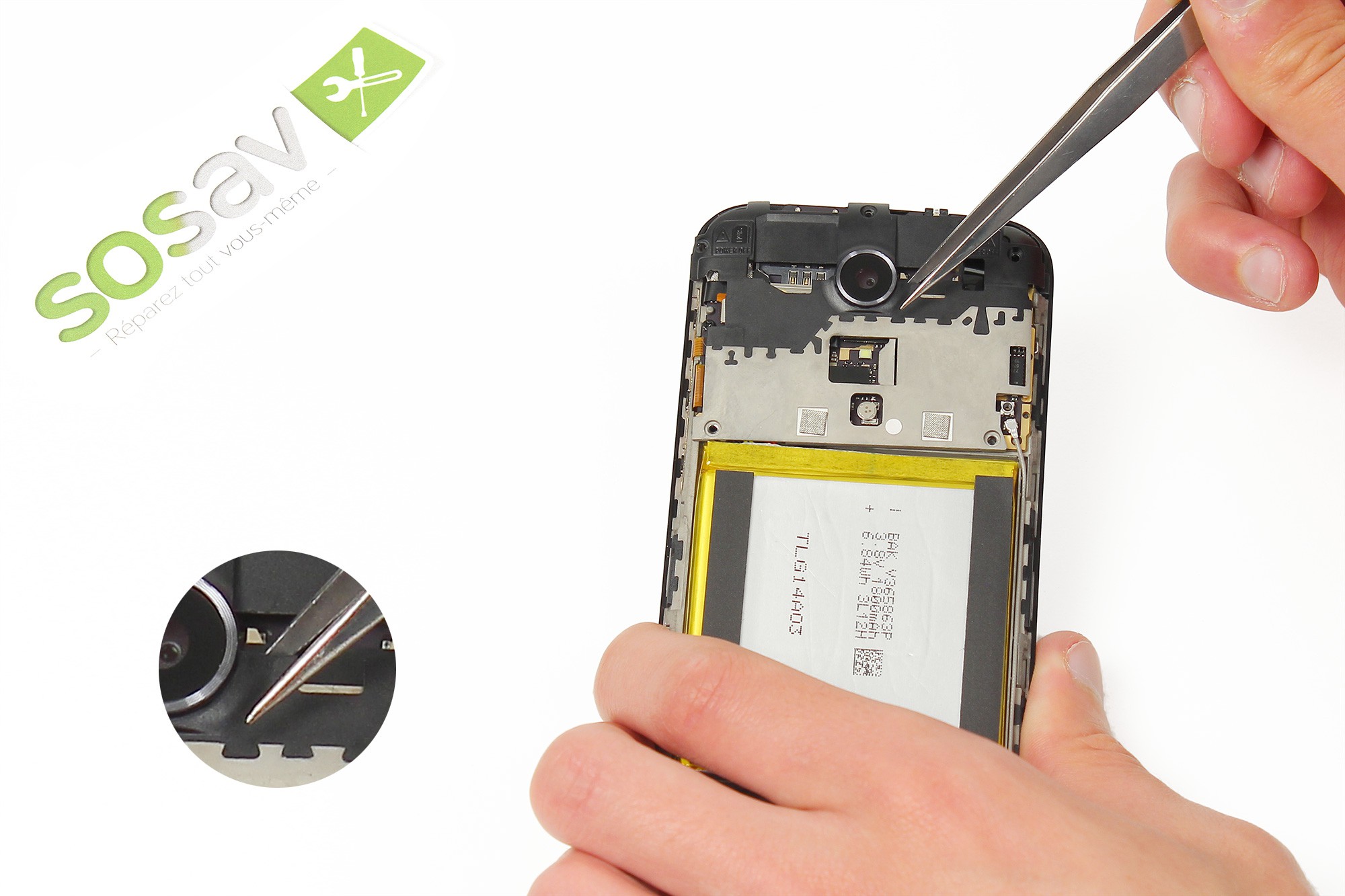 A l'aide d'une pince, retirez l'adhésif noir apposé sur le connecteur haut du câble d'interconnexion.