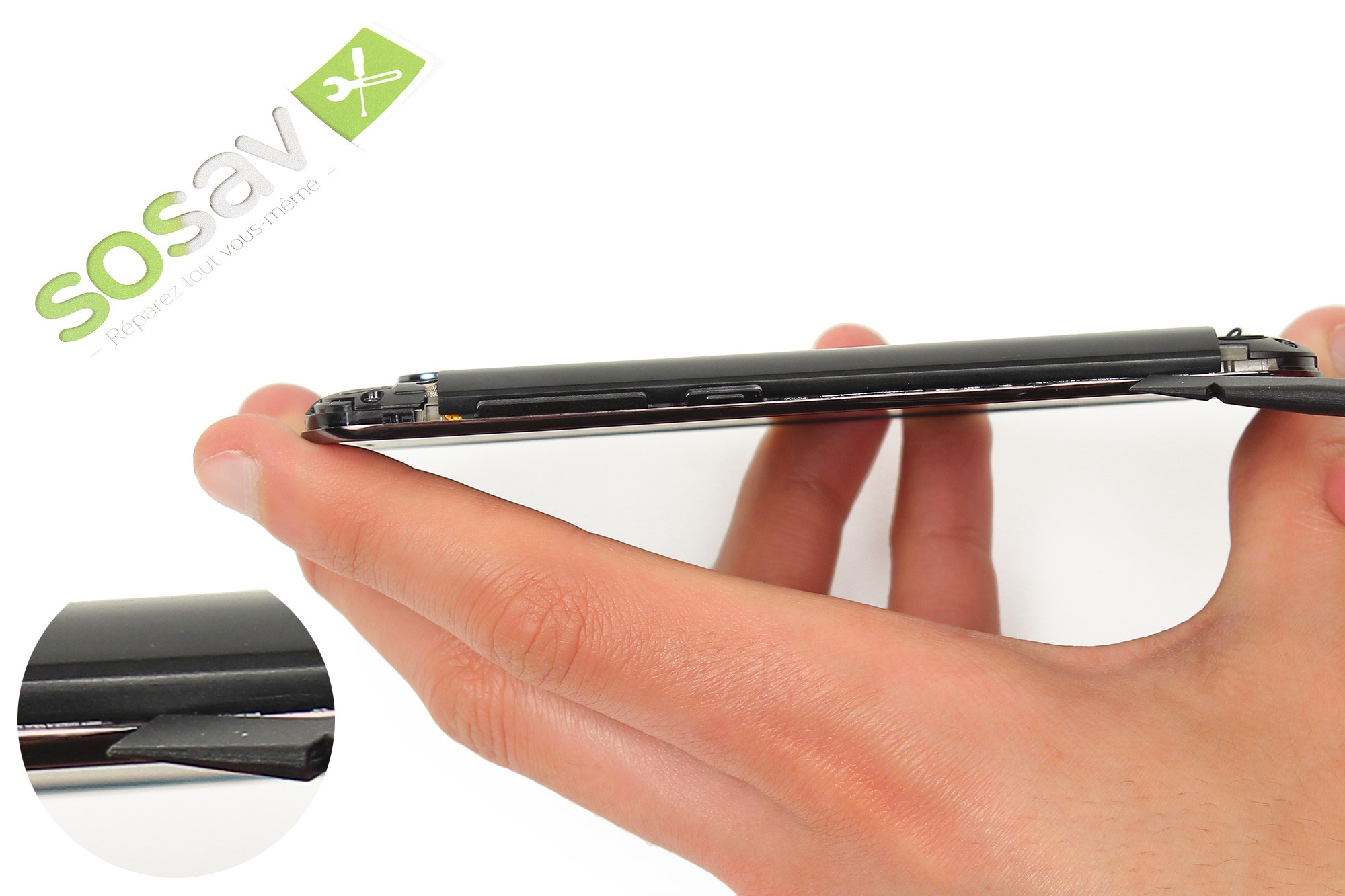 Pour cela, insérez la spatule dans l'interstice présente sur la tranche gauche du téléphone puis faites-la glisser lentement.
