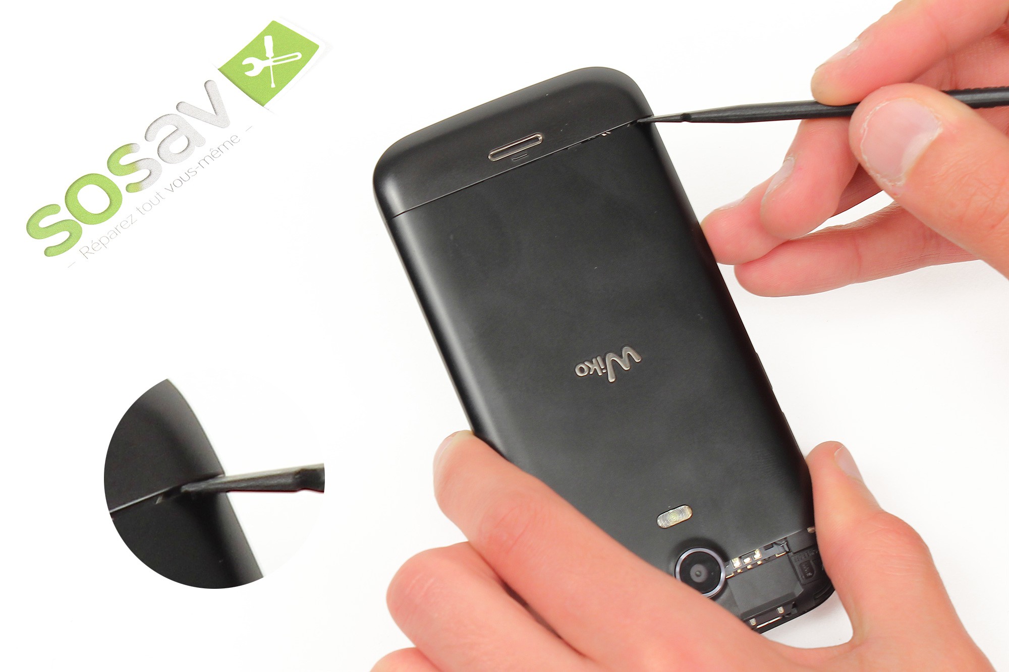 A l'aide d'une spatule en nylon, déclipsez le cache supérieur du téléphone.