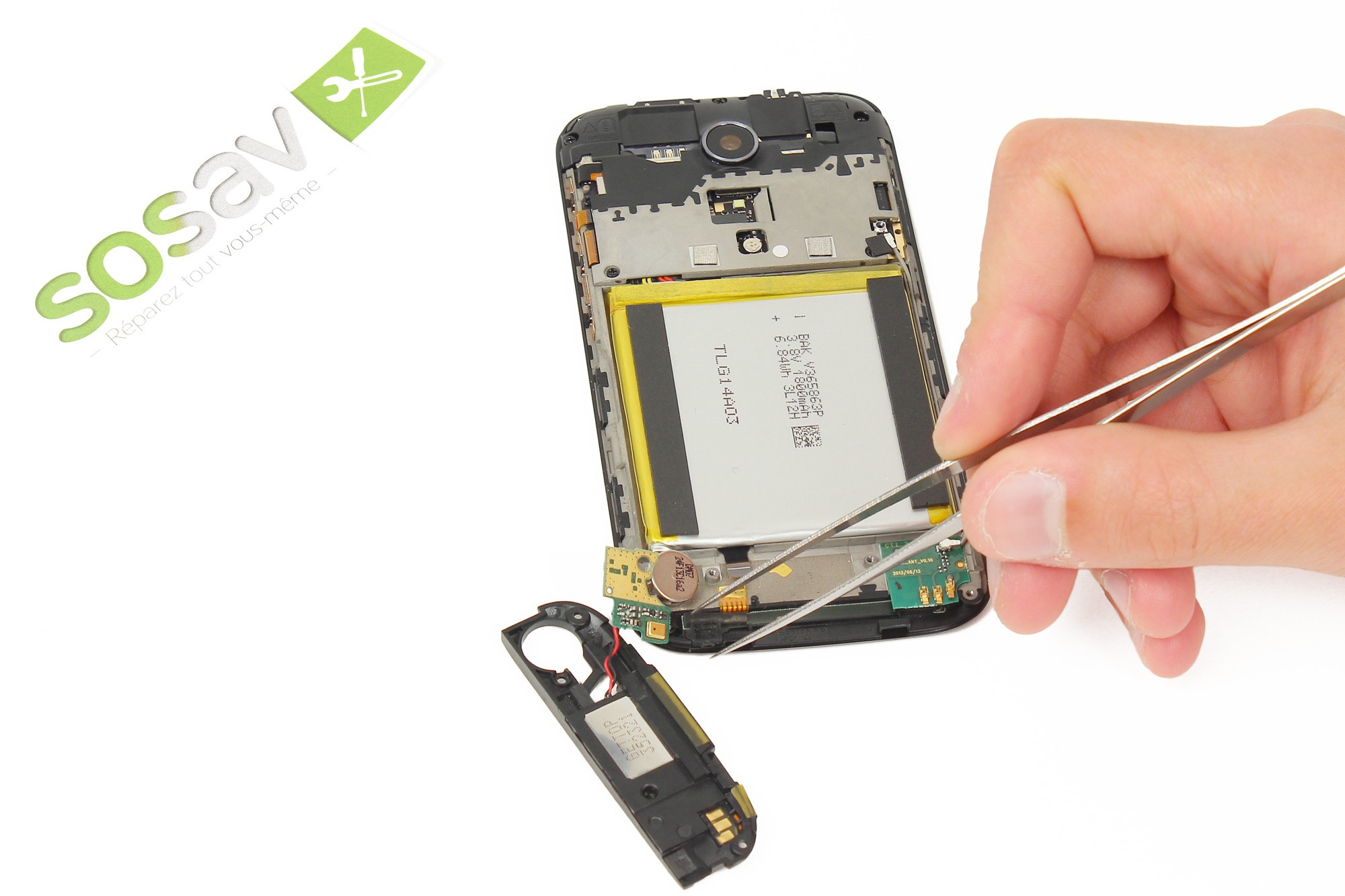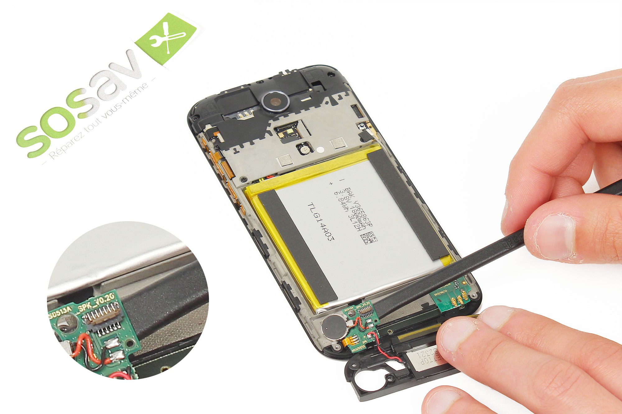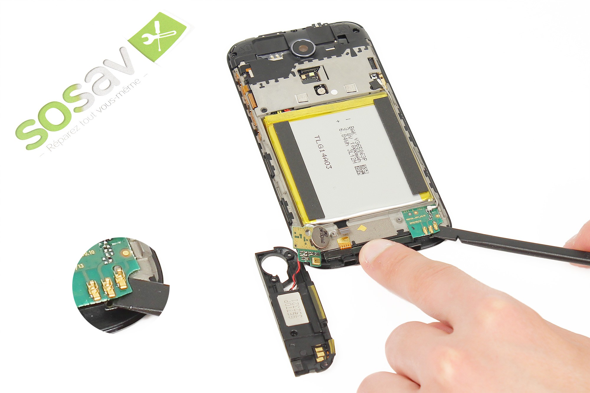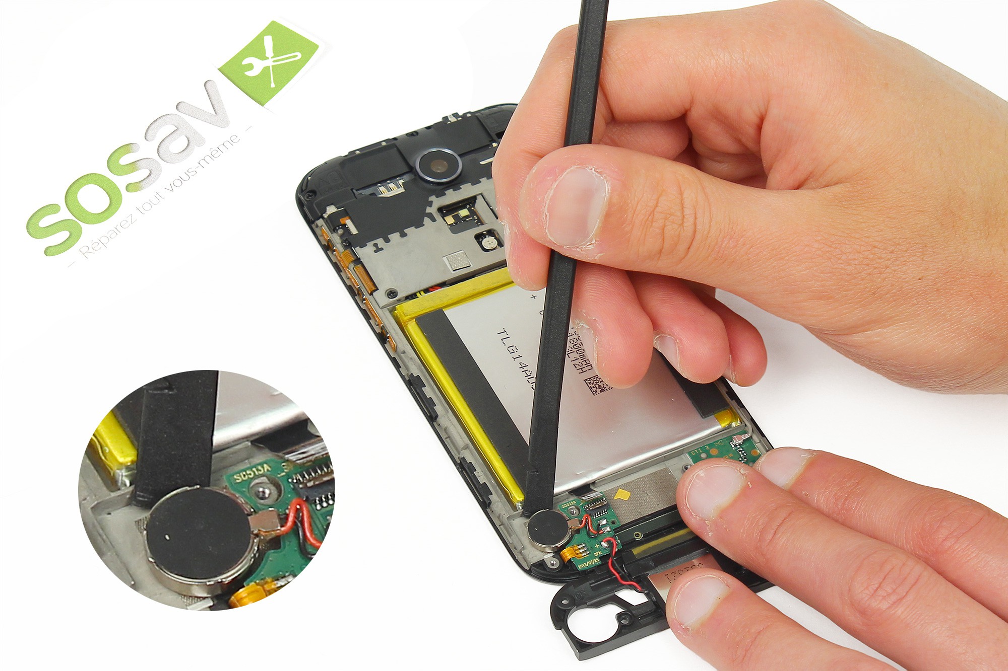 Avec cette spatule en nylon, décollez le vibreur sans le retirer, ce dernier étant lié à la carte via deux fils soudés.