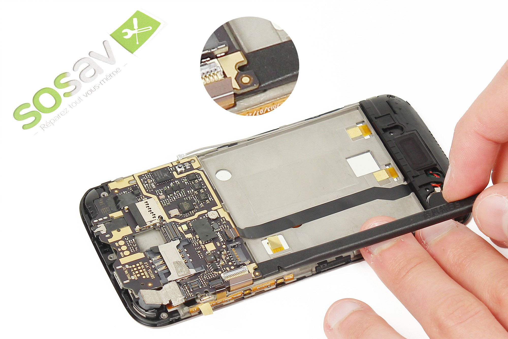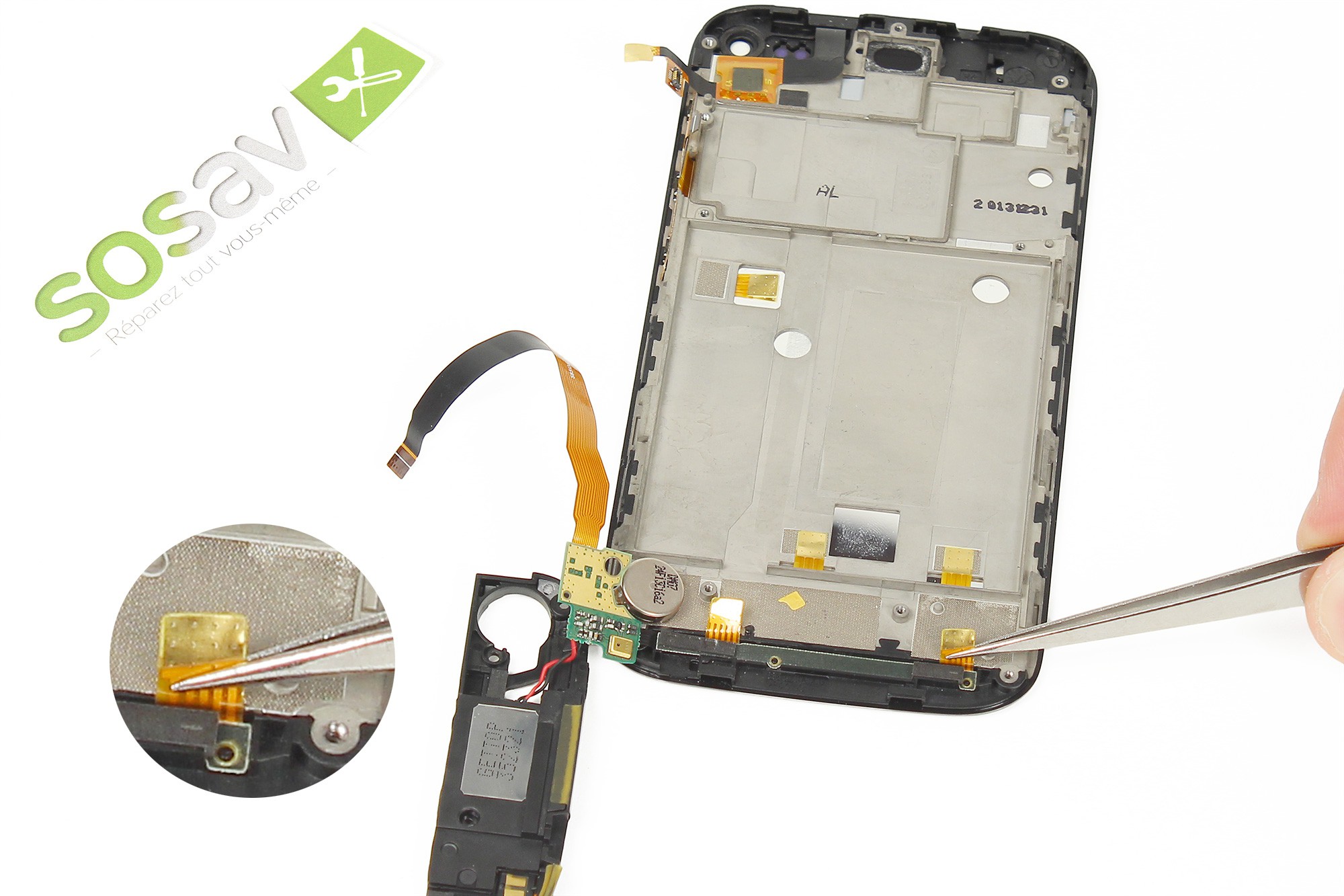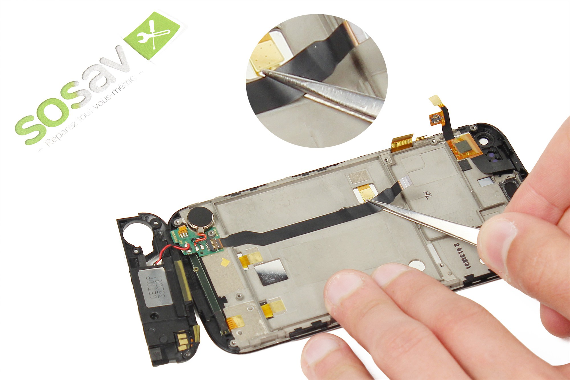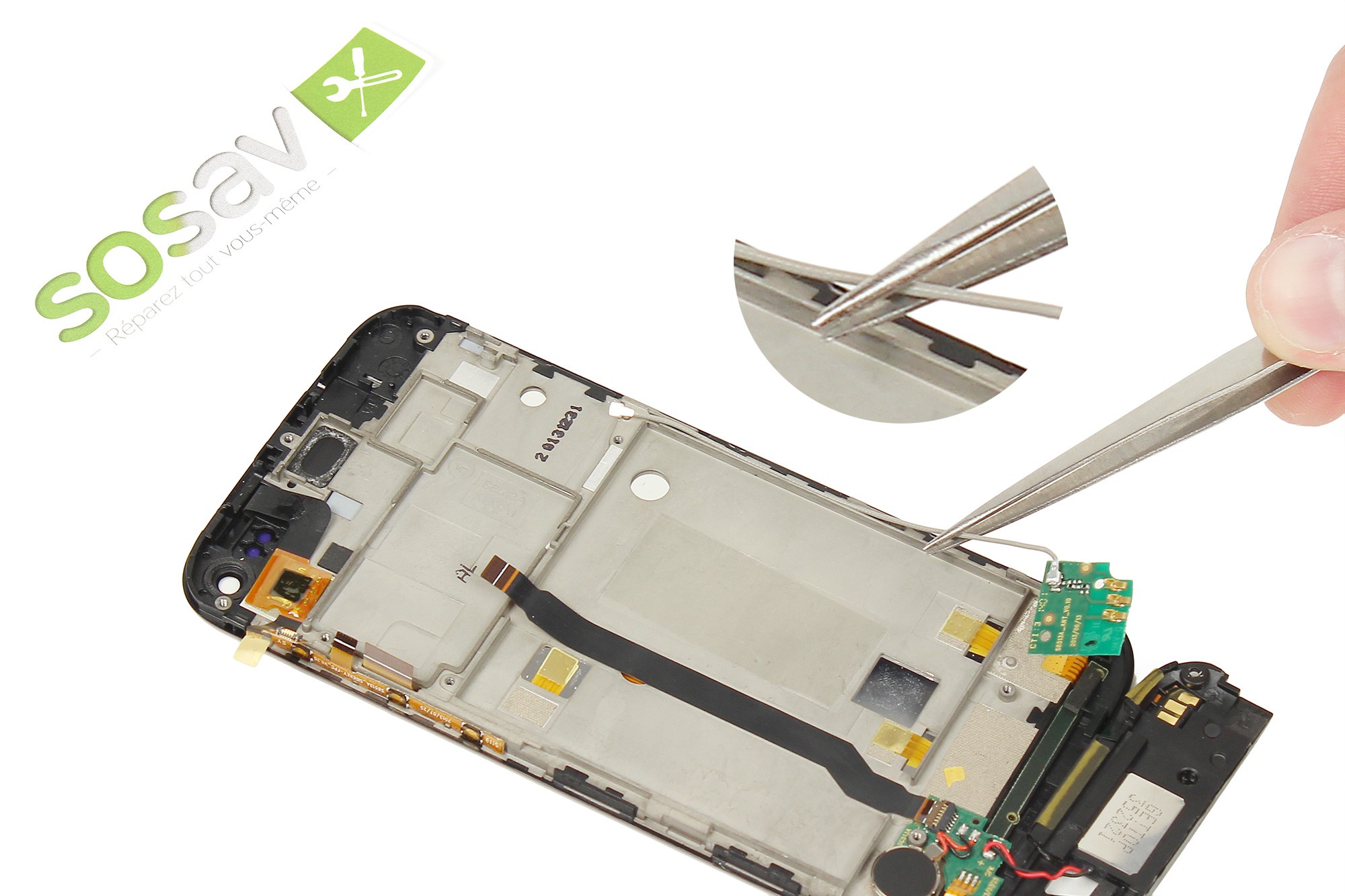 Toujours avec la pince, décollez très délicatement du châssis du téléphone la nappe de liaison de la carte gestion du bas.