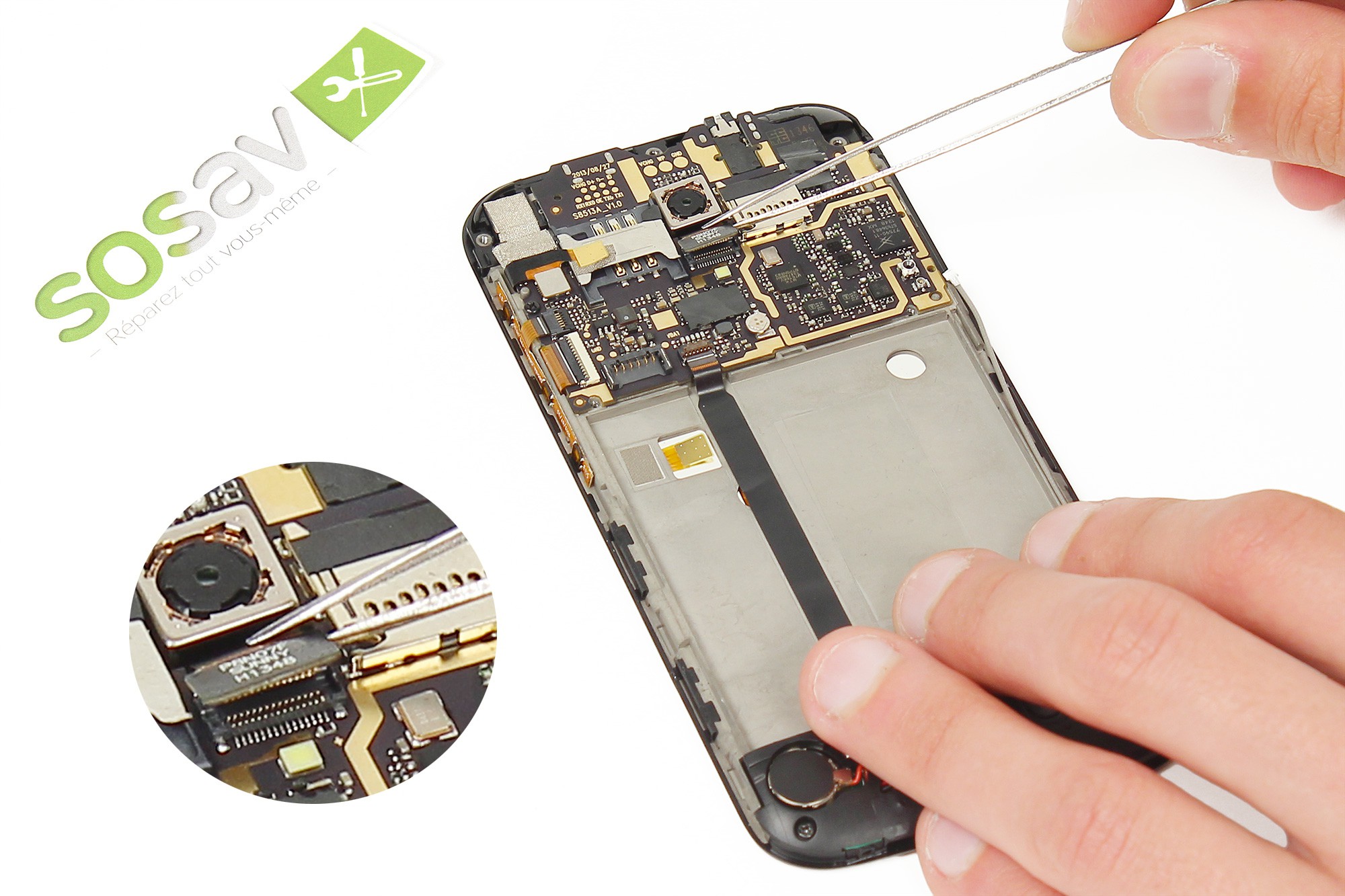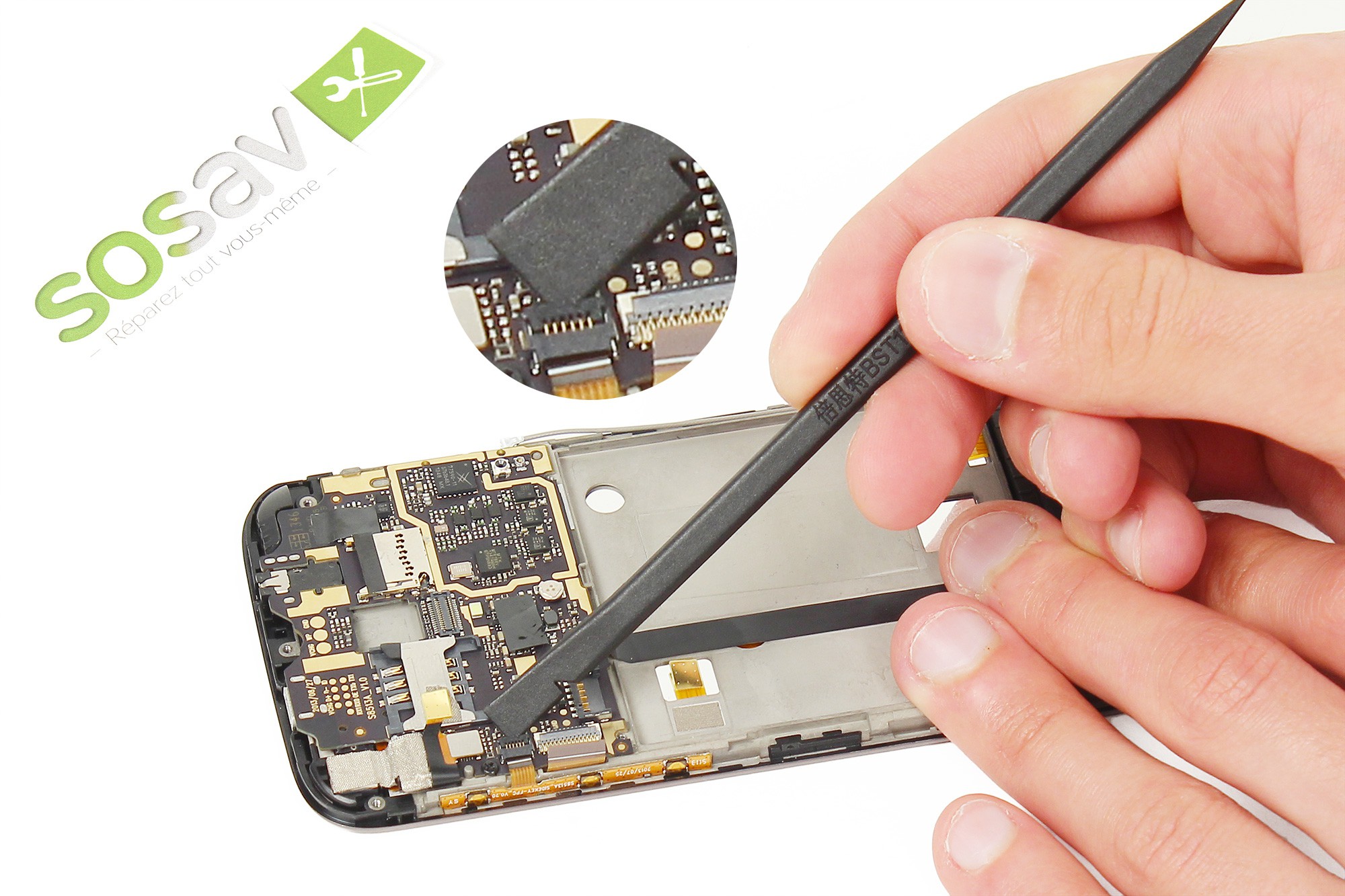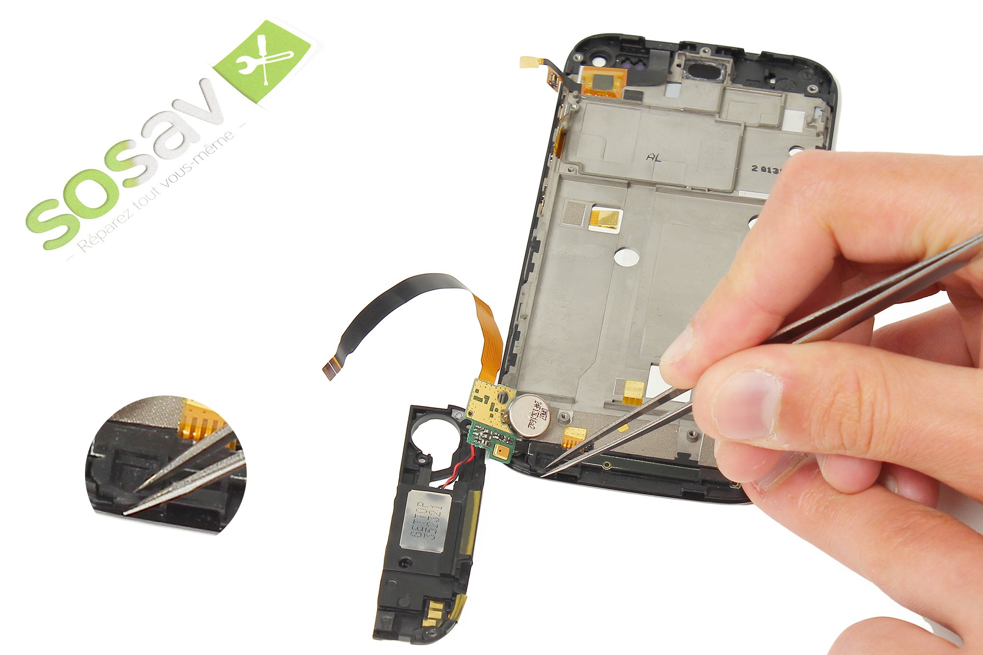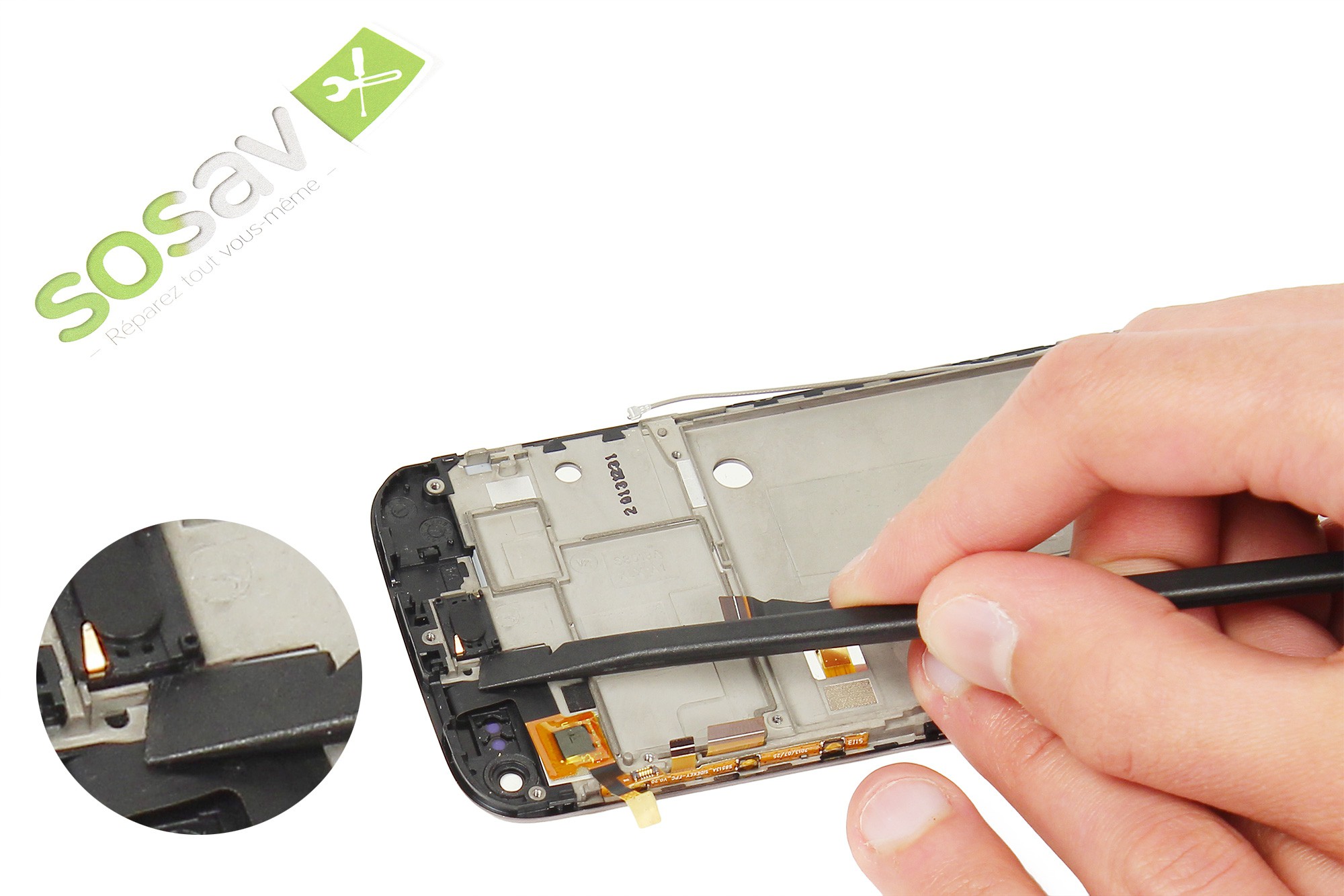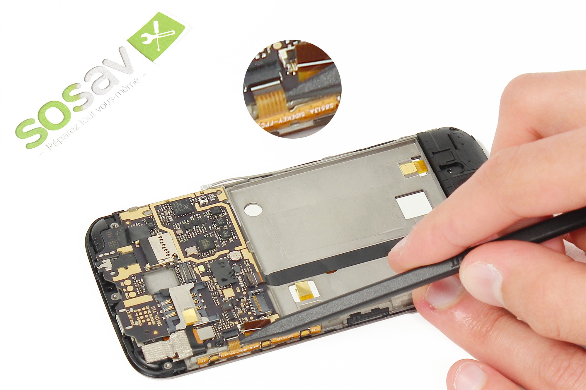 Toujours avec la pince, décollez très délicatement du châssis du téléphone la nappe de liaison de la carte gestion du bas.